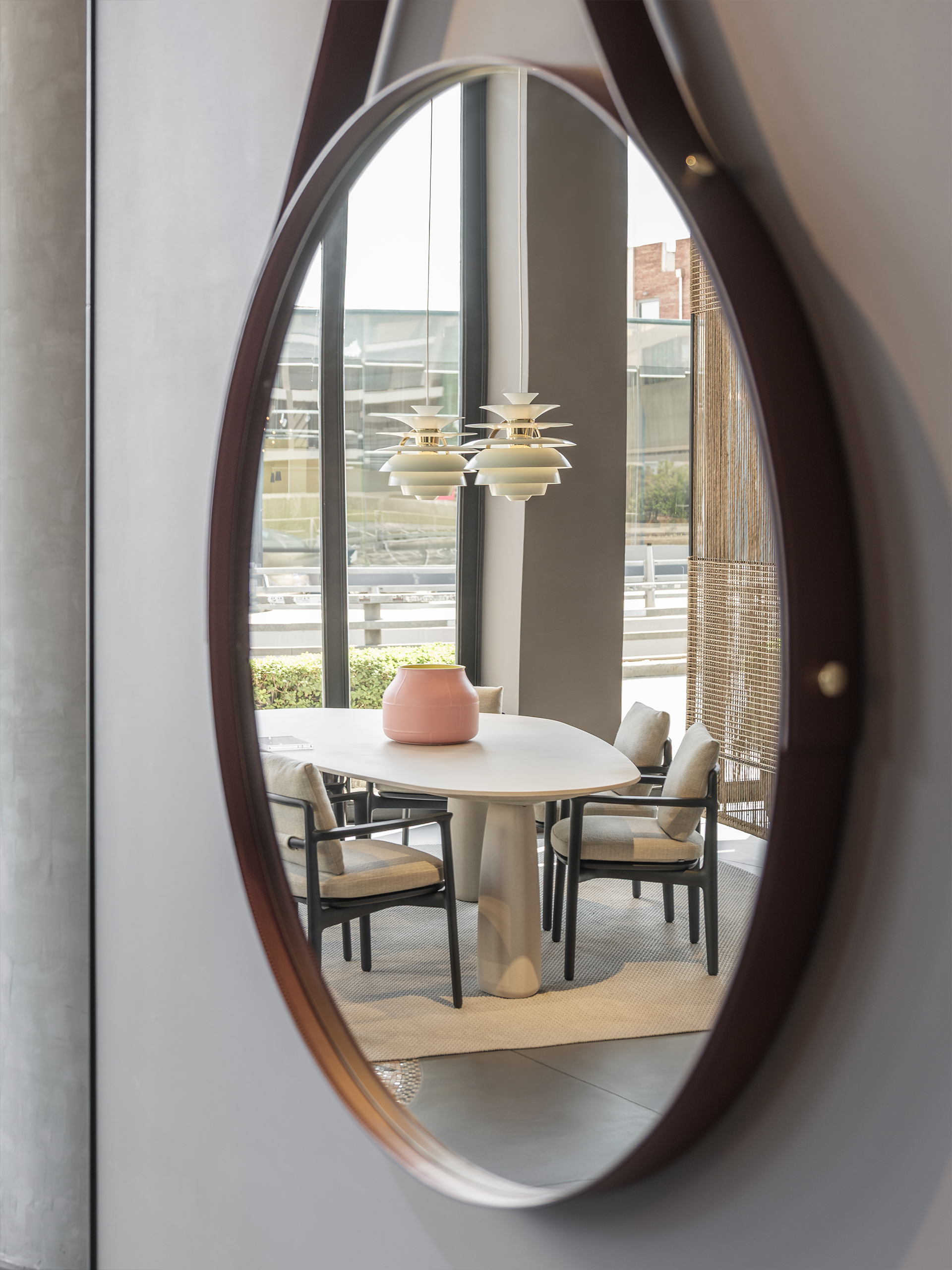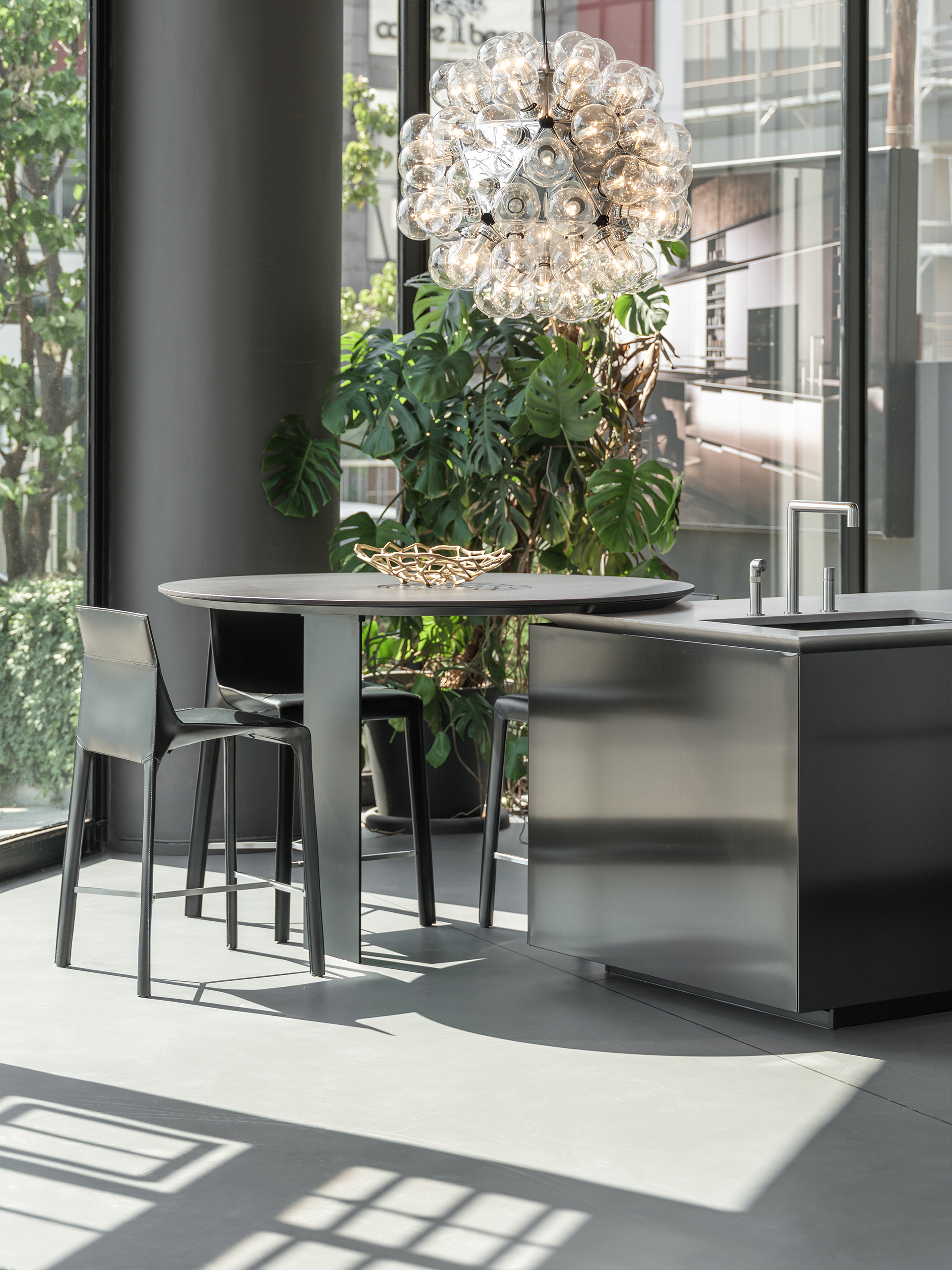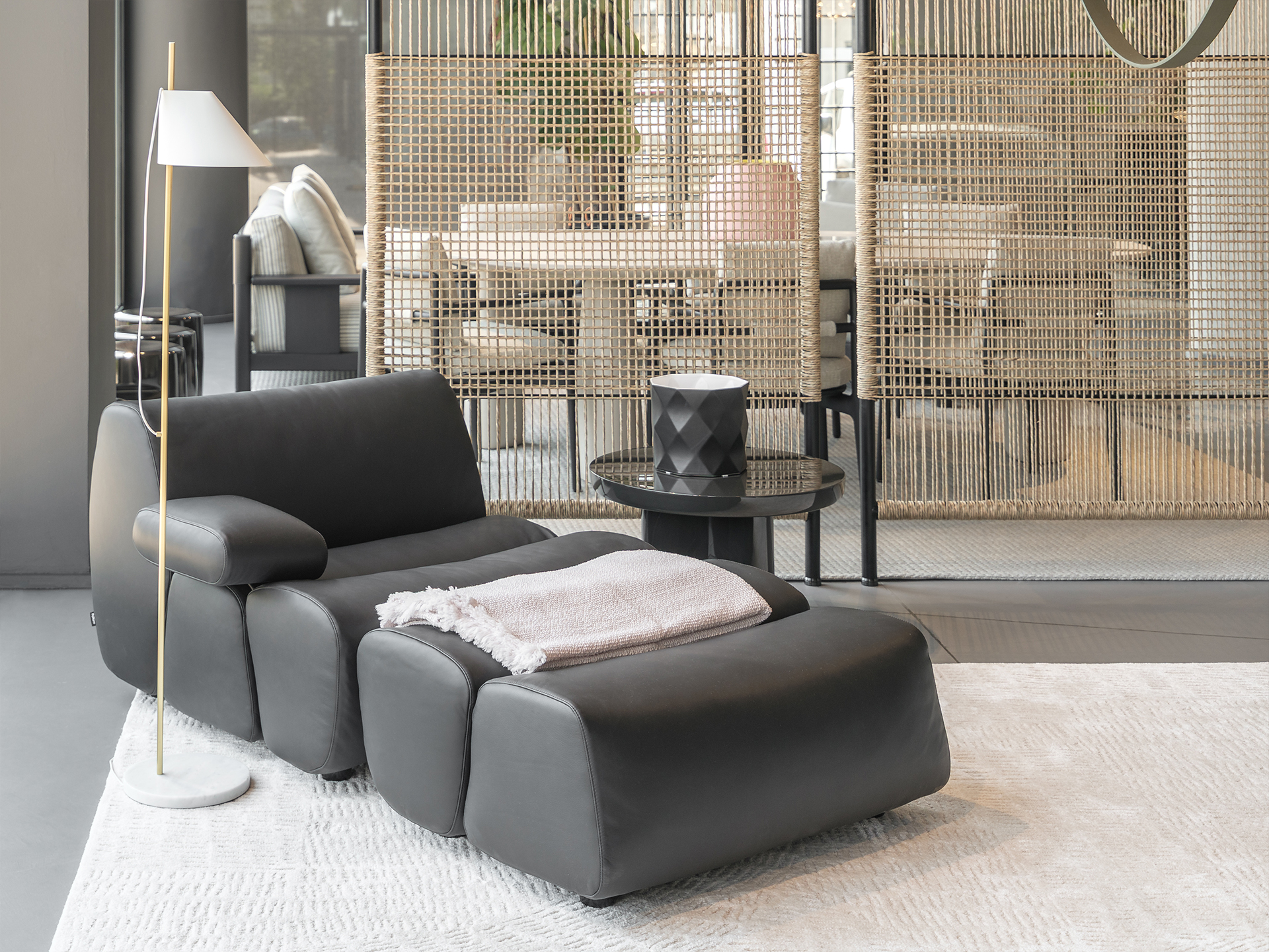 The space is set up both with new products and best sellers, there are two settings for the living area, made cosy and convivial by the modular Ernest and Saint Germain systems and that are placed besides the dining area and its functional complements. Moreover there is a dedicated area for the outdoor space of a home with the Ketch sofas at centerstage, alongside a dining setup with the Monolith table and the Magnolia chairs.