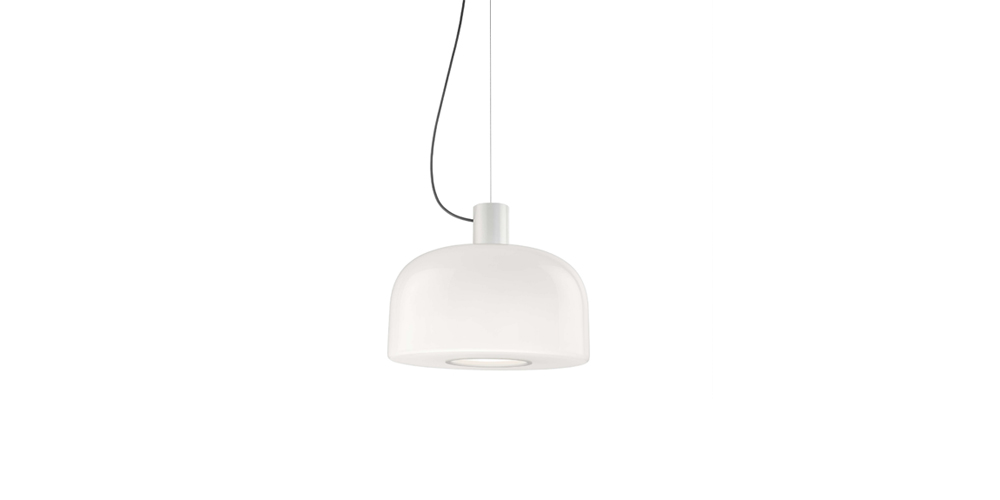 Bellhop Glass Suspension can be used it as an ambient but also as a task light, which directly illuminates, with a non-blinding cone of light, the surface on which it is suspended.The hole in the bottom part of the lamp, protected by an aluminum element, is shaped to direct the light (and change the bulb) avoiding the diffusion up to the eyes of those sitting at the table. A cone of light is therefore created inside the suspended Bellhop Glass, which expands homogeneously in the environment on all sides and lands on the table precisely, like a torch, visually signaled by the colored aluminum ring that surrounds the lower opening of the lamp.