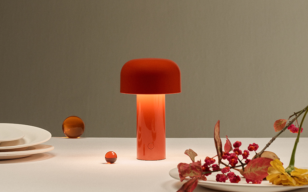 Rechargeable direct light table lighting device. Base and dome in coloured PC. Diffuser in Opaline injection moulded photo-engraved PC. 24-hours’ autonomy, charging via Micro-USB-C. Push-button switch positioned on the base provides the 4-step dimmer function. Battery status indicator positioned under the base. USB-C charging cable included, useful length 120cm. USB battery charging on plug with interchangeable plugs.