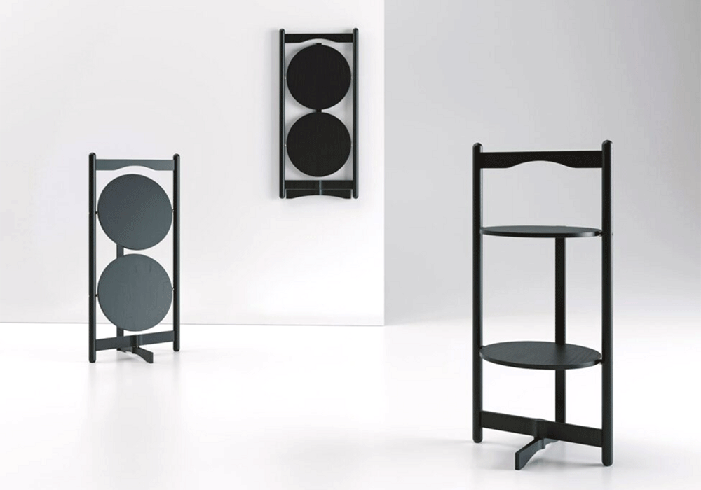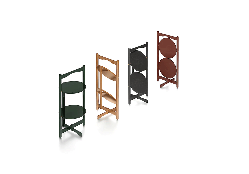 Originally created by Vico Magistretti in 1989, Florian is one of the new 2021 designs remastered from the Acerbis archives. Ingeniously functional, the Florian represents Magistrettìs supreme simplicity, with a lightweight, multi-level table built on a foldable structure inspired by a broom handle, which collapses flat to hang on the wall as a graphic object of circles and lines. In Meda and Lopez Quincoces’s version, the Florian’s size adapts to modern living, its ash wood frame folds smoothly and quickly with a modern brass mechanism, and its graphic impact is bolstered with lacquered tones of mustard, green spruce and brick — a democratic passe-partout for the contemporary home.