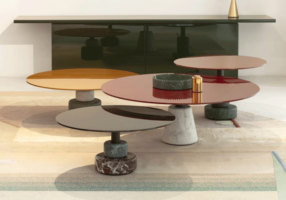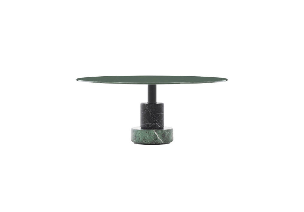With a daring approach to materials, the Menhir low table becomes a composition of colors and textures that eloquently illustrate the sculptural simplicity of Lodovico Acerbis and Giotto Stoppinòs inventions of new forms. With a Greek-like classicism, the tablès column connects the monumental marble base, matte in its contemporary version, to a tabletop newly rendered in lacquered wood or black ash wood and natural walnut, creating a striking exchange between colors and elements. Newly conceived in three different heights, the Menhir low table vaunts a more dramatically-sized round top, and now appears as a tall console as well — a concept from the original designs today in production for the first time.