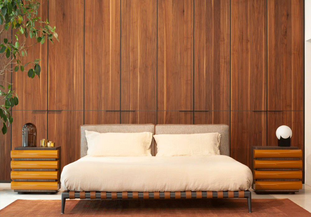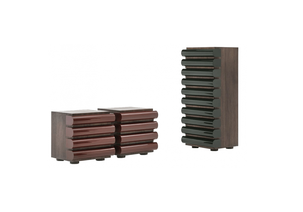 A playful, ACillar of drawers, the Storet cabinet epitomizes the visionary touch of Nanda Vigòs designs, now modernized with a brightly lacquered wood contrast and brand new proportions. In both its elongated vertical edition, and in the nightstand designed by Vigo but manufactured for the first time only now, the Storet reflects today’s advances in production, with the walnut’s visible grain illuminating Acerbis’s modern expertise in utilizing extensive wood surfaces. The cabinet, though made entirely of a single material, creates a potent game of colorplay, tempered by the pacifying shades and the natural quality of the wood.