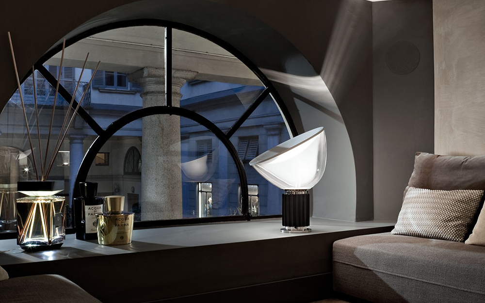 Table lamp providing indirect and reflected light. Reflector in painted aluminium, gloss white on the outside and matt white on the inside. Directionable diffuser. Body in matt black. silver anodized or bronze anodized aluminium.  Base in nickel-plated metal. Electric cable of useful length 220 cm, with dimmer switch for ON/OFF and adjustment of the light flow between 10-100%. Plug-in power supply with interchangeable plugs.