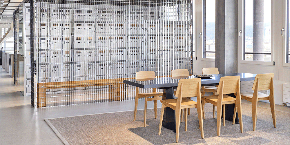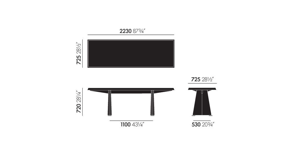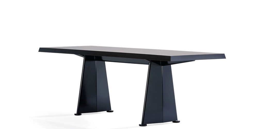 Jean Prouvé originally designed the Trapèze table for the Cité Universitaire in Antony near Paris. The trapezoidal shape of the sheet steel legs provided inspiration for the name and also gives the table its distinctive character.