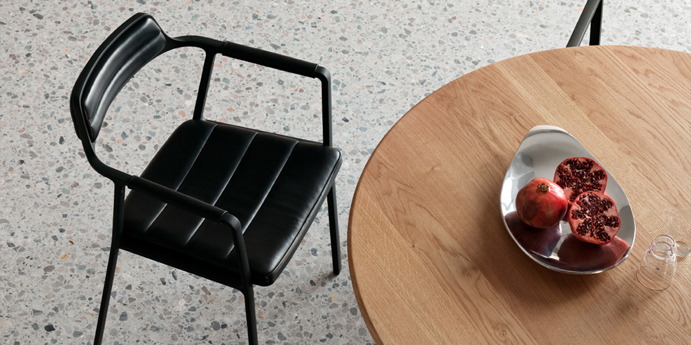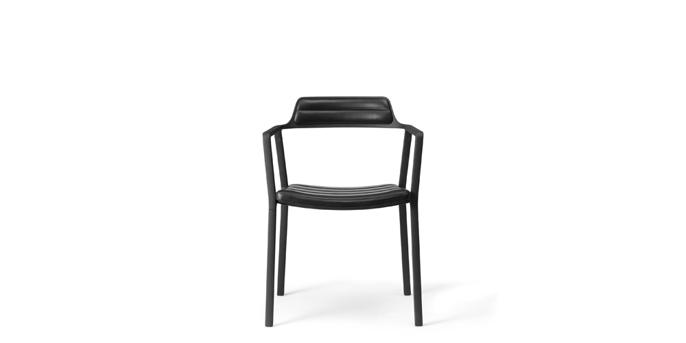 The Vipp chair is suitable for the dining or living room and is the first chair introduced in Vipp’s portfolio of furniture. The chair features a powder-coated or polished aluminum frame with rounded armrests and a slim backrest. The upholstery is available in either black or sand-colored leather with unique characteristics.