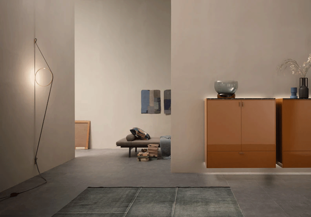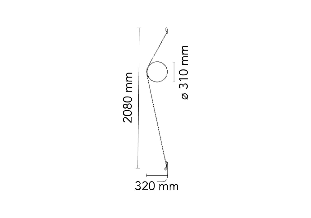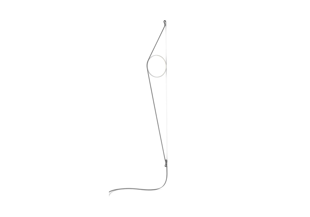 Indirect light wall lighting device with body in calendered, extruded aluminium with galvanised or varnished finish. The special tangent cable, in coloured rubber, provides the power. The cable is fixed to the wall with ABS joints in the same finish as the ring. Dimming via switch pedal on the cable. Power supply on adapter with interchangeable plugs. Useful cable length is 2.5 metres.