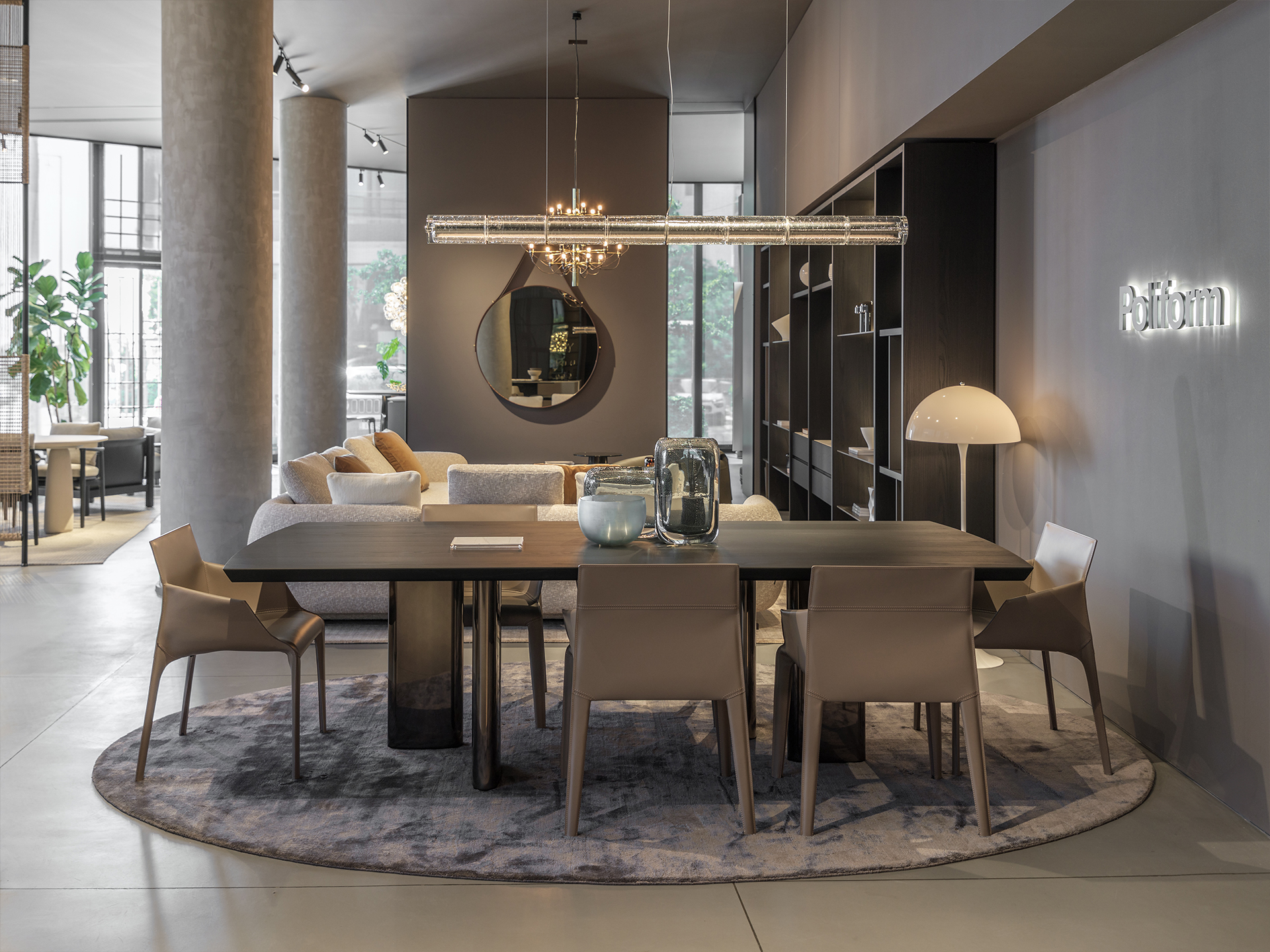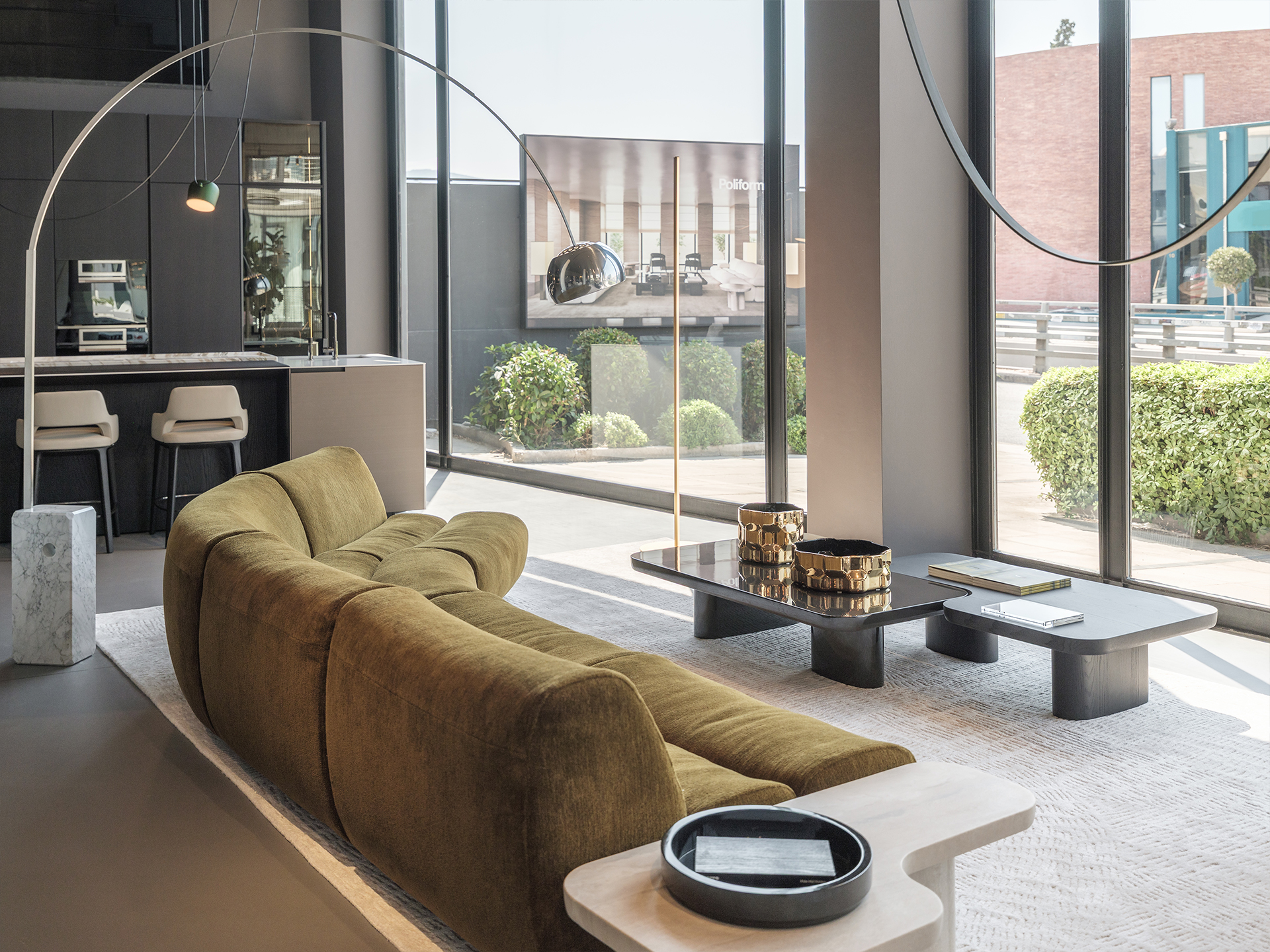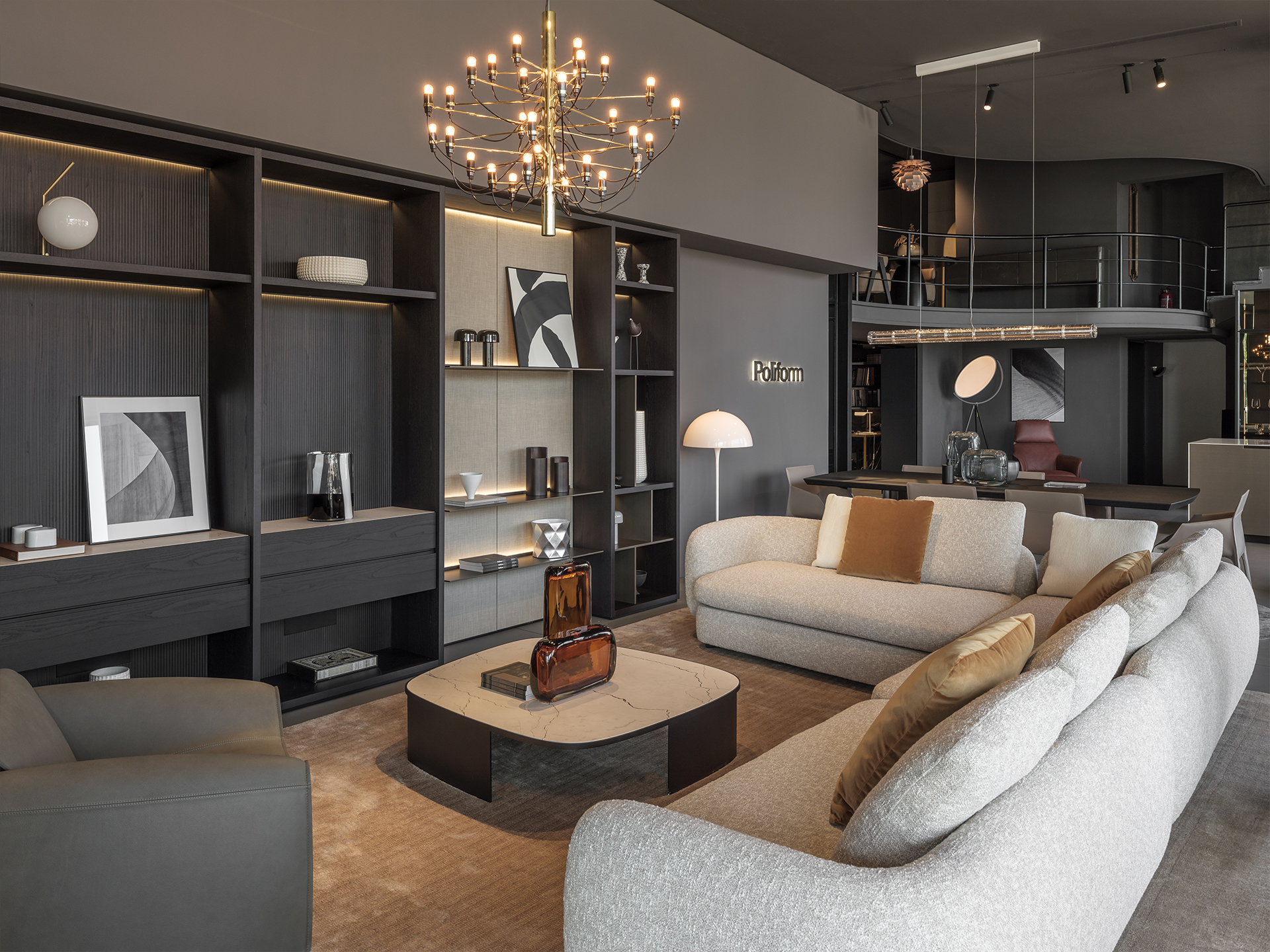 The new Poliform exhibition space is aligned with the ease of living and elegance that define the brand. The space in its entirety brings out the allure of the Poliform way of living. Through the large windows on the ground floor and even before entering the store, one can sense the elegance and refined design of Poliform collections, which recreate the ideal of a complete home.