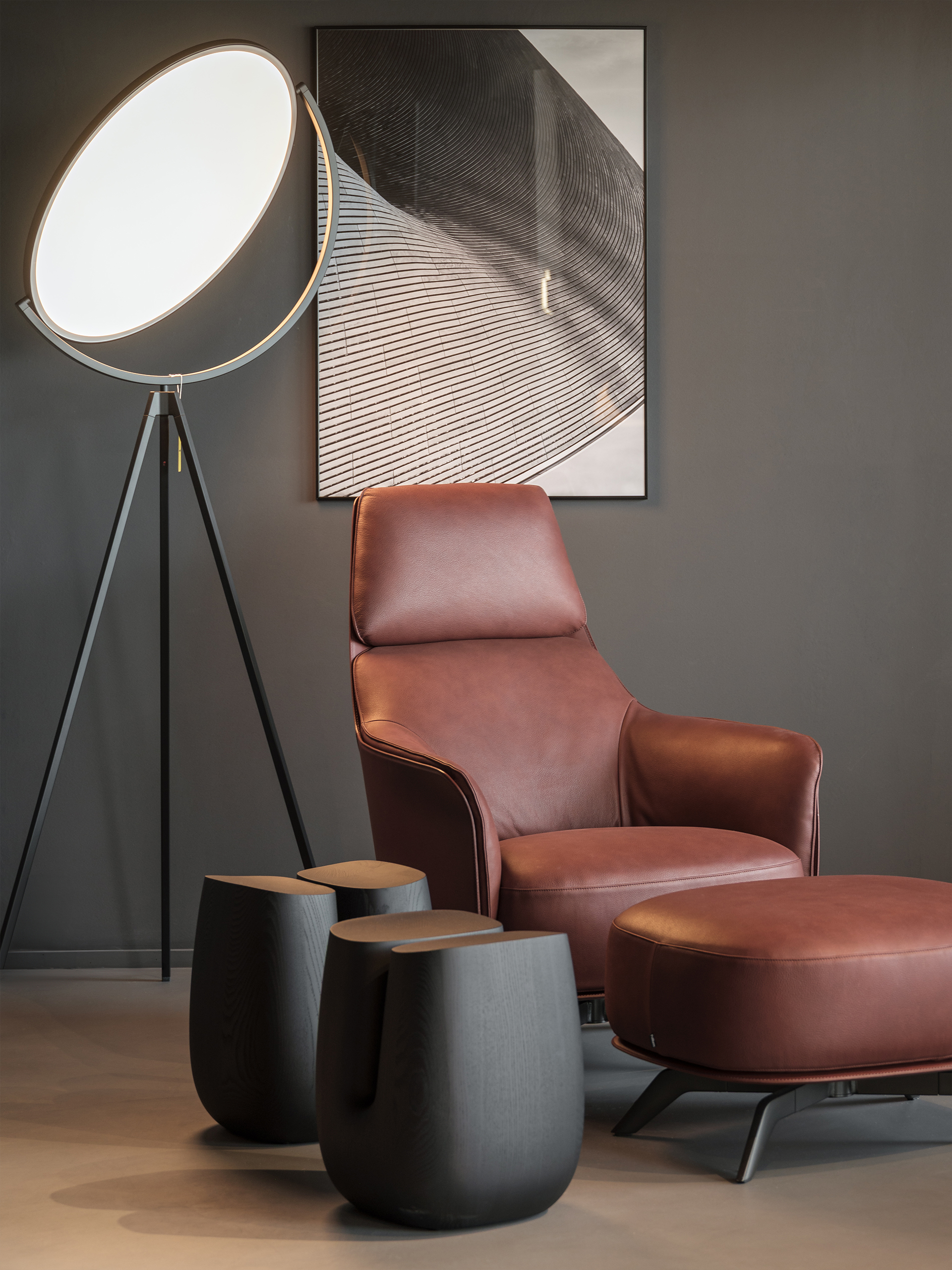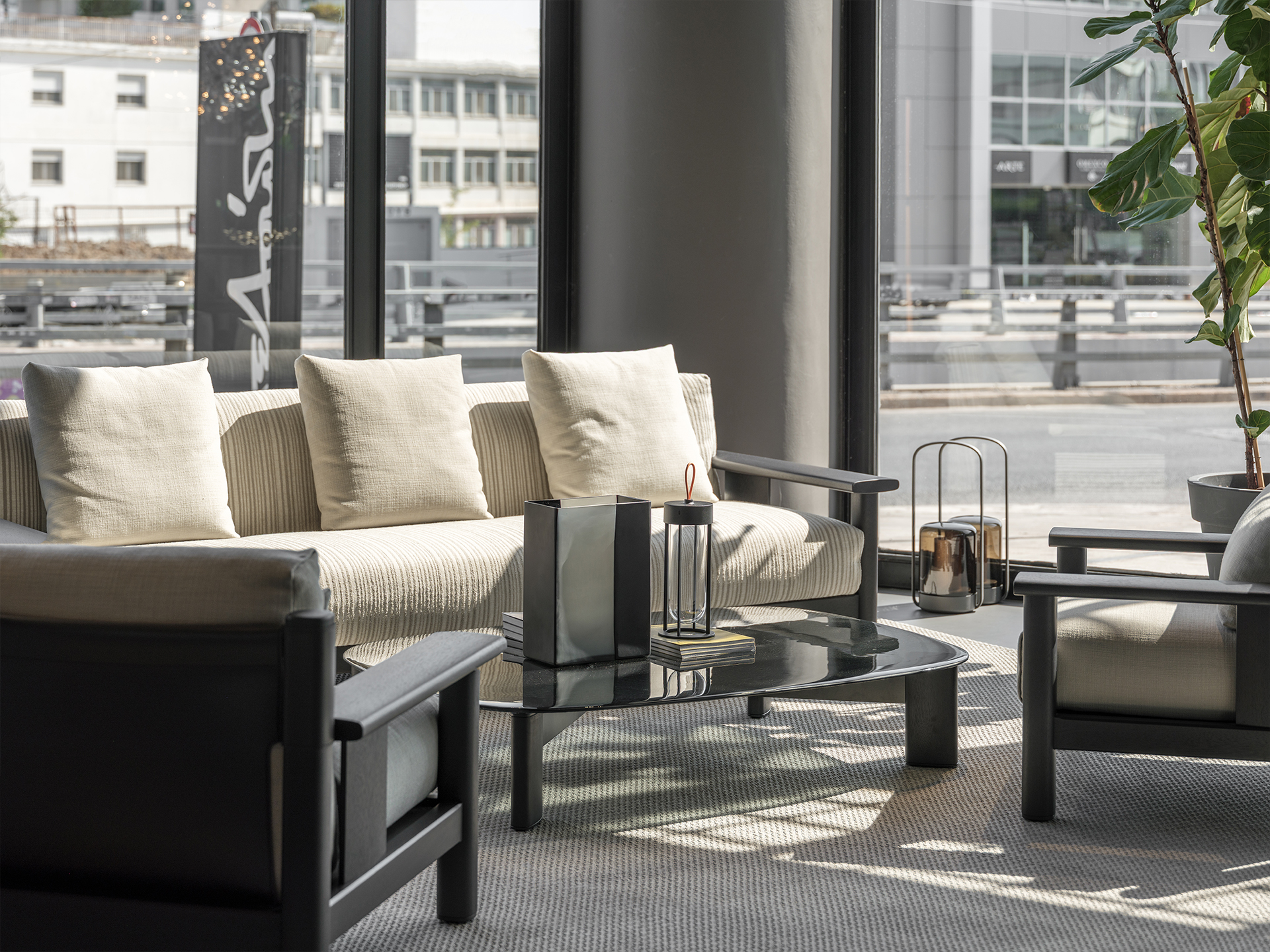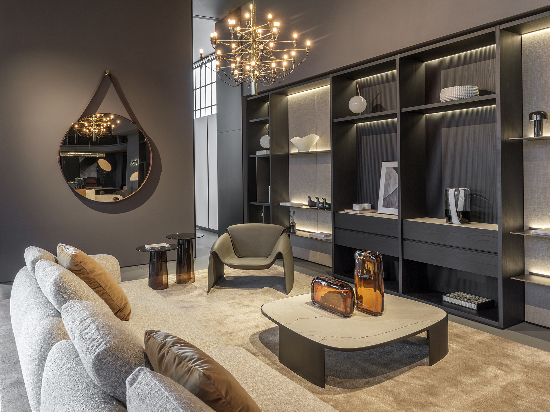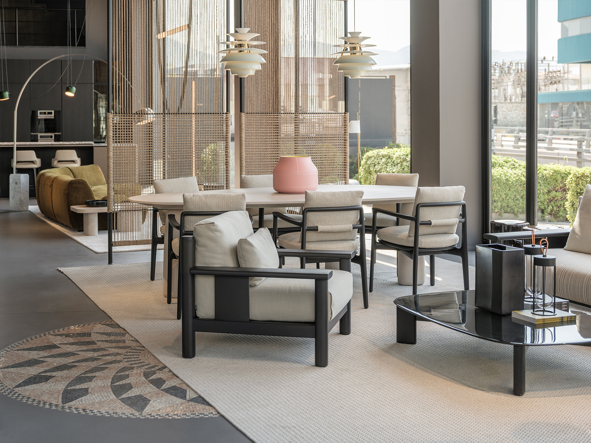 The space is set up both with new products and best sellers, there are two settings for the living area, made cosy and convivial by the modular Ernest and Saint Germain systems and that are placed besides the dining area and its functional complements. Moreover there is a dedicated area for the outdoor space of a home with the Ketch sofas at centerstage, alongside a dining setup with the Monolith table and the Magnolia chairs.