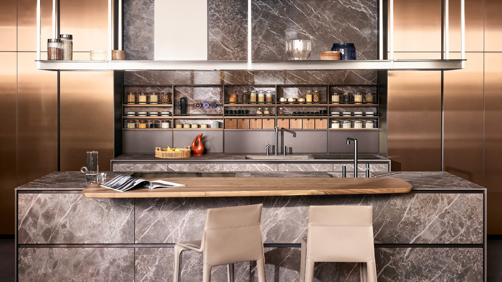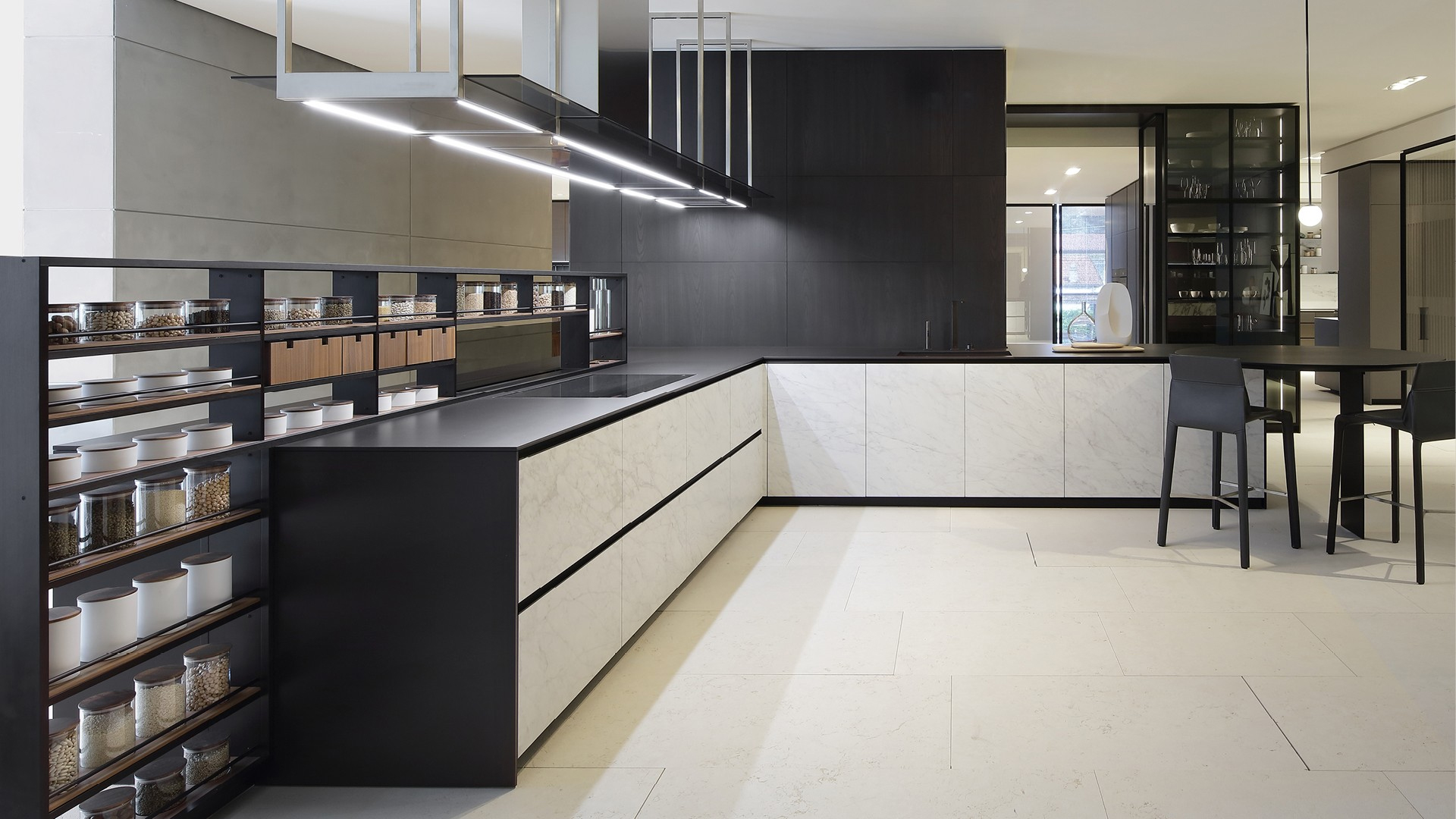 Reduced thickness, groove opening, and maximum versatility in the choice of finishes: these are the characteristics that make the Alea door unique for compositional possibilities and customisation. A linear design made of flat surfaces and geometric volumes, capable of redefining the kitchen environment by combining a very high operational capability with a minimalistic style.