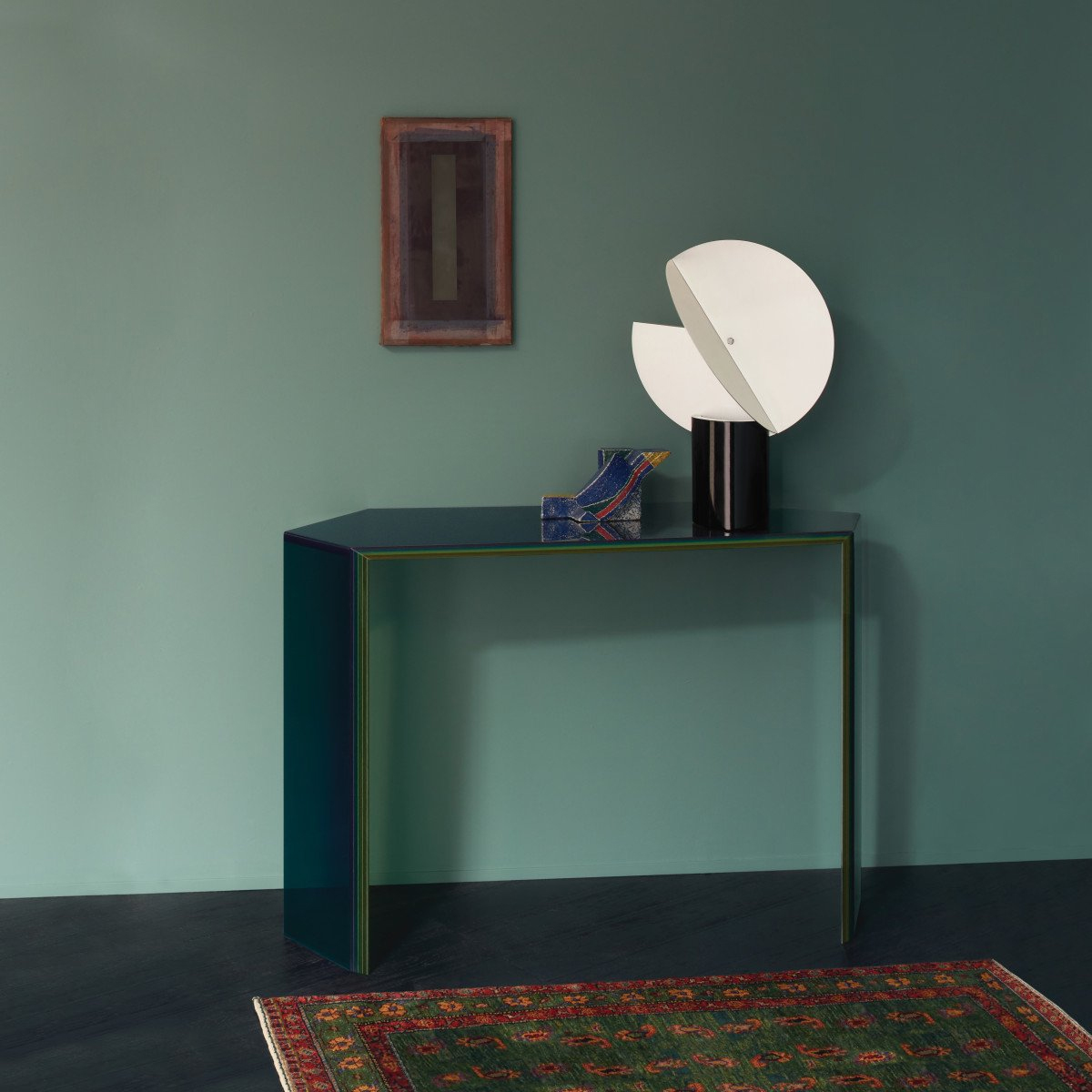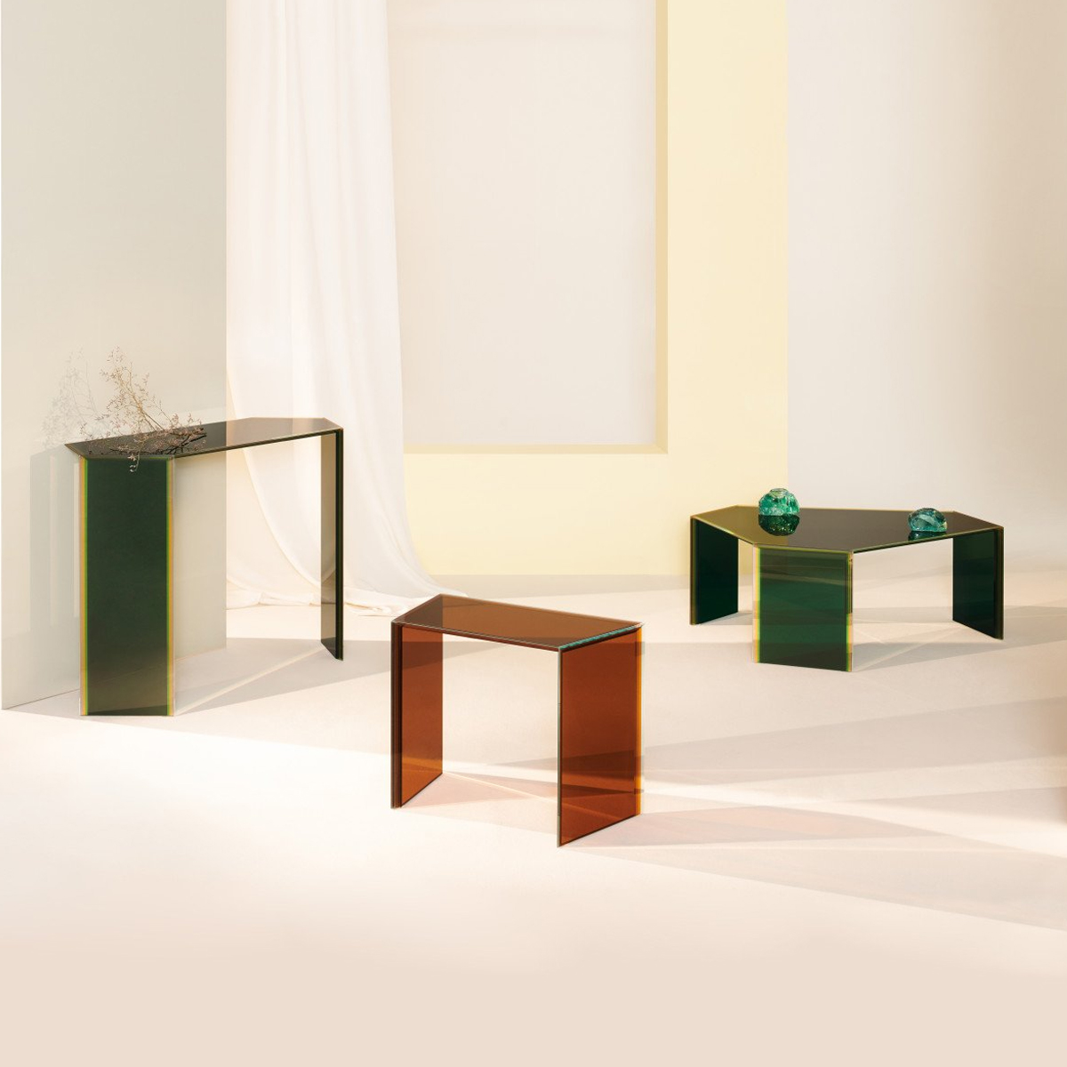 Collection Collection of high tables, low tables and console, made in multi-layered and multichromatic glass, created by laminating five slabs of 5mm extralight glass each with a different coloured film. The obtained glass sheets are in different shapes, shiny ground polished and “faceted” by means of unique bevels accentuating through the transparency of the glass the stunning multicoloured material. The different components are then welded together in total clarity, by means of a special gluing technique, so creating very precious “furniture jewels”.