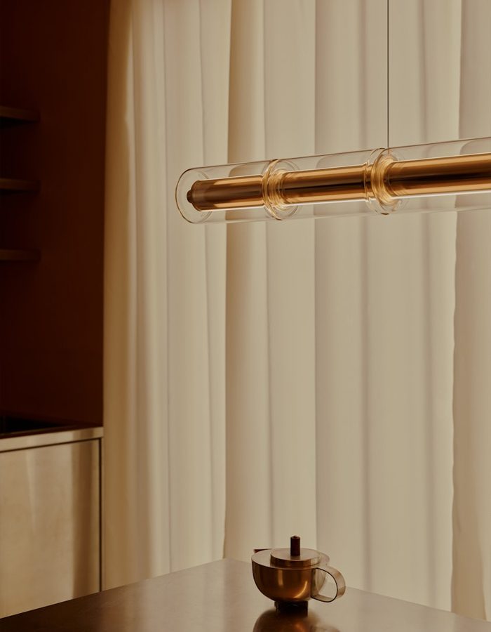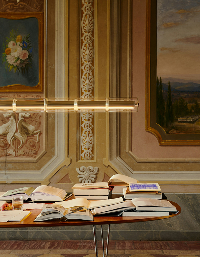Modular suspension lamp emitting diffused light. Horizontal body in polished extruded aluminium with two LED strips for upward and downward emission. Integrated touch dimmer enables independent control of light outputs. Body encased in a sequence of borosilicate glass cylinders separated by traditional spacers