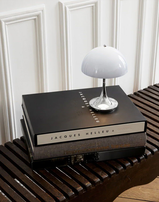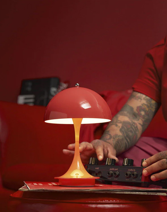 The Panthella lamp design is one of Verner Panton’s most significant designs, reflecting the Danish architect’s larger-than-life personality. He aimed to create an organic-shaped lamp that provides 100% glare-free light, with both the stand and the shade serving as light reflectors.Panton succeeded by making the Panthella lamp with Louis Poulsen in 1971. The lamp’s characteristic shape and ability to reflect soft light from its trumpet-shaped base have cemented its status as a design icon.The Panthella 160 Portable lamp is a downscaled version of the original design. The lamp is only 160 mm in diameter, making it the perfect size to take from room to room or outside on the balcony or in the garden, where it will look amazing and create a wonderful ambience.