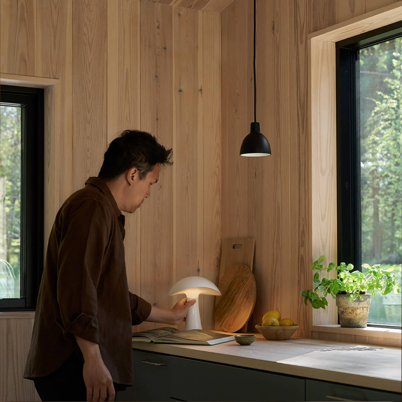 The name “Rumee” is a playful blend of meanings, drawing from both Danish and English. Combining the Danish word “rum” (meaning space or room) with the English word “me,” while also echoing the sound of “roomie” — the informal term for a roommate. This bi-lingual play on words evokes the idea of someone you share a home with, a companion that brings a sense of warmth and comfort. The portable nature of the Rumee allows you to bring the coziness of being at home to whatever room you desire. This Rumee 220 Portable Lamp will create moments of comfort and joy whether you’re reading a book to your child or enjoying a game with friends; it’s always there to share in the experience, both at home or on the road.