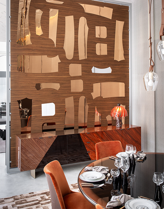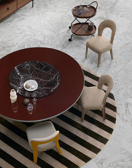 Exuding luxury and refinement, the Sigillo FF table features a clean, elevated aesthetic. The top is embellished with an FF logo in the centre that recalls wax seal stamps, while the central column base adds a sense of stability and concreteness. The circular top, available in two sizes, plays with multiple combinations of materials for added versatility.