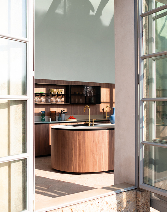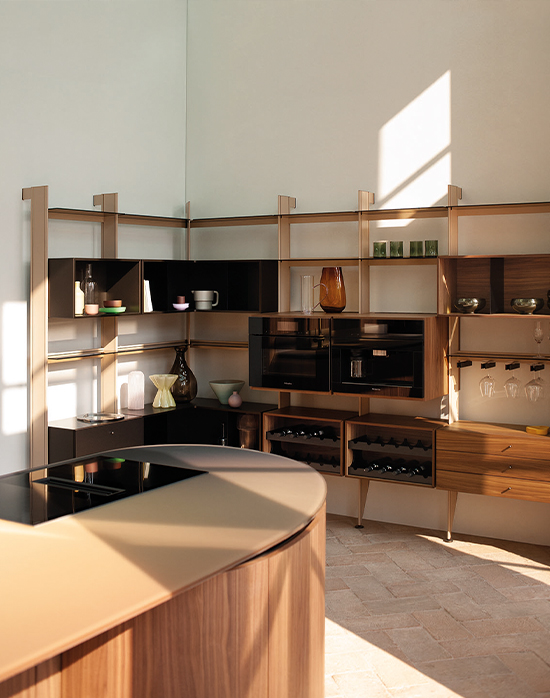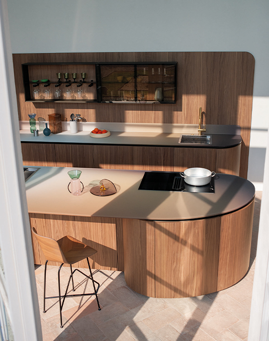 Tangram is made up five curved elements that can be combined with straight elements at will, to build kitchen islands with unusual shapes, compositions set against the wall, or even solutions that wrap around corners.