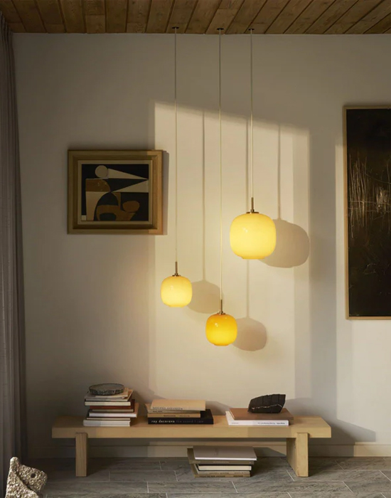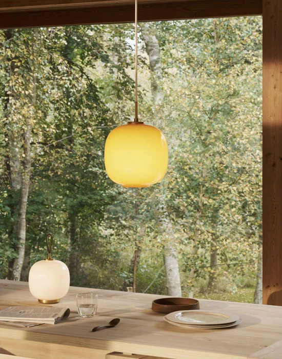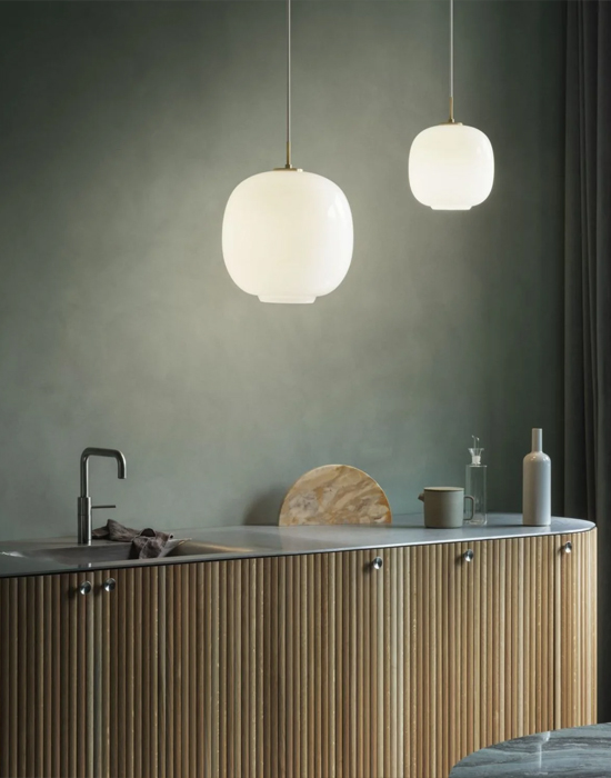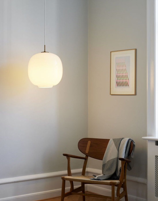 The renowned Danish functionalist architect Vilhelm Lauritzen designed the VL 45 Radiohus Pendant in the late 1930s as part of his total work of art, Radiohuset (The Radio House), headquarters of the Danish Broadcasting Corporation, which was inaugurated just after the end of World War II in 1945.Lauritzen designed the pendant and all other lamps for Radiohuset in collaboration with Louis Poulsen. The pendant was initially named the Office Lamp, featuring a glossy, three-layer, mouth-blown glass shade with untreated brass details.The design maintains its excellent lighting benefits and quiet luxury appearance that aligns well with contemporary interior trends today, where it features beautiful variants of the original Opal white version in Pale rose, Pale yellow and Amber.