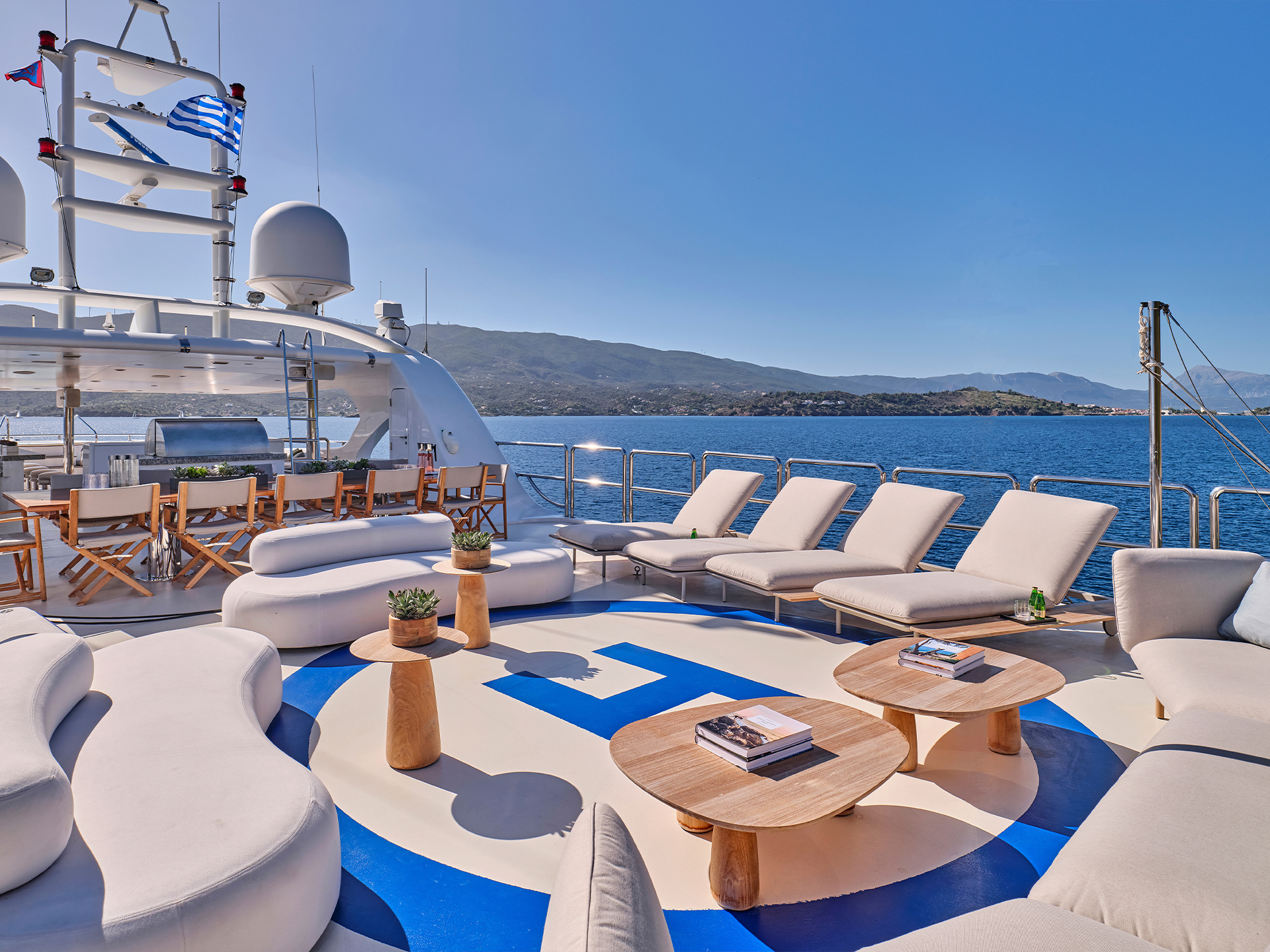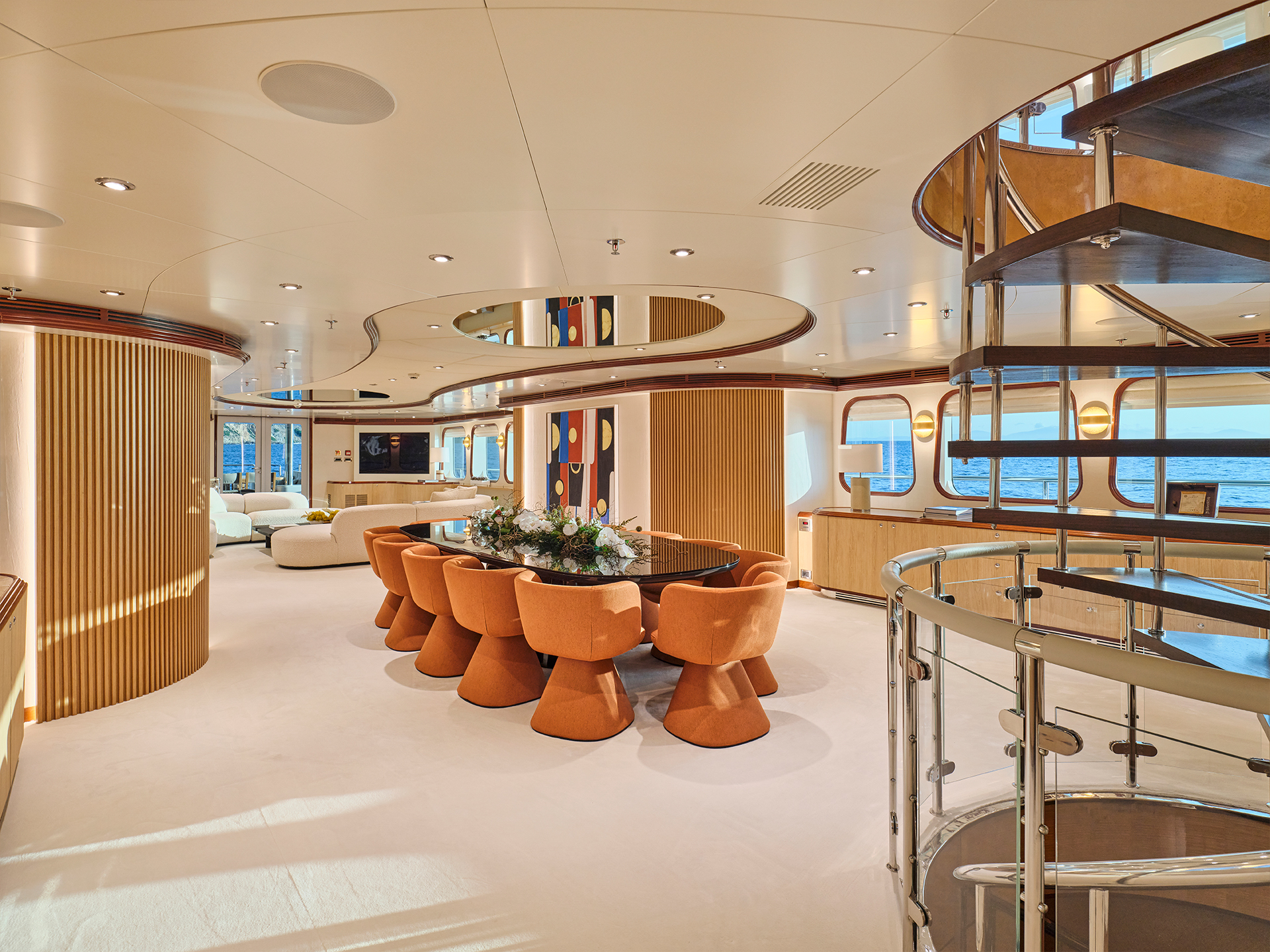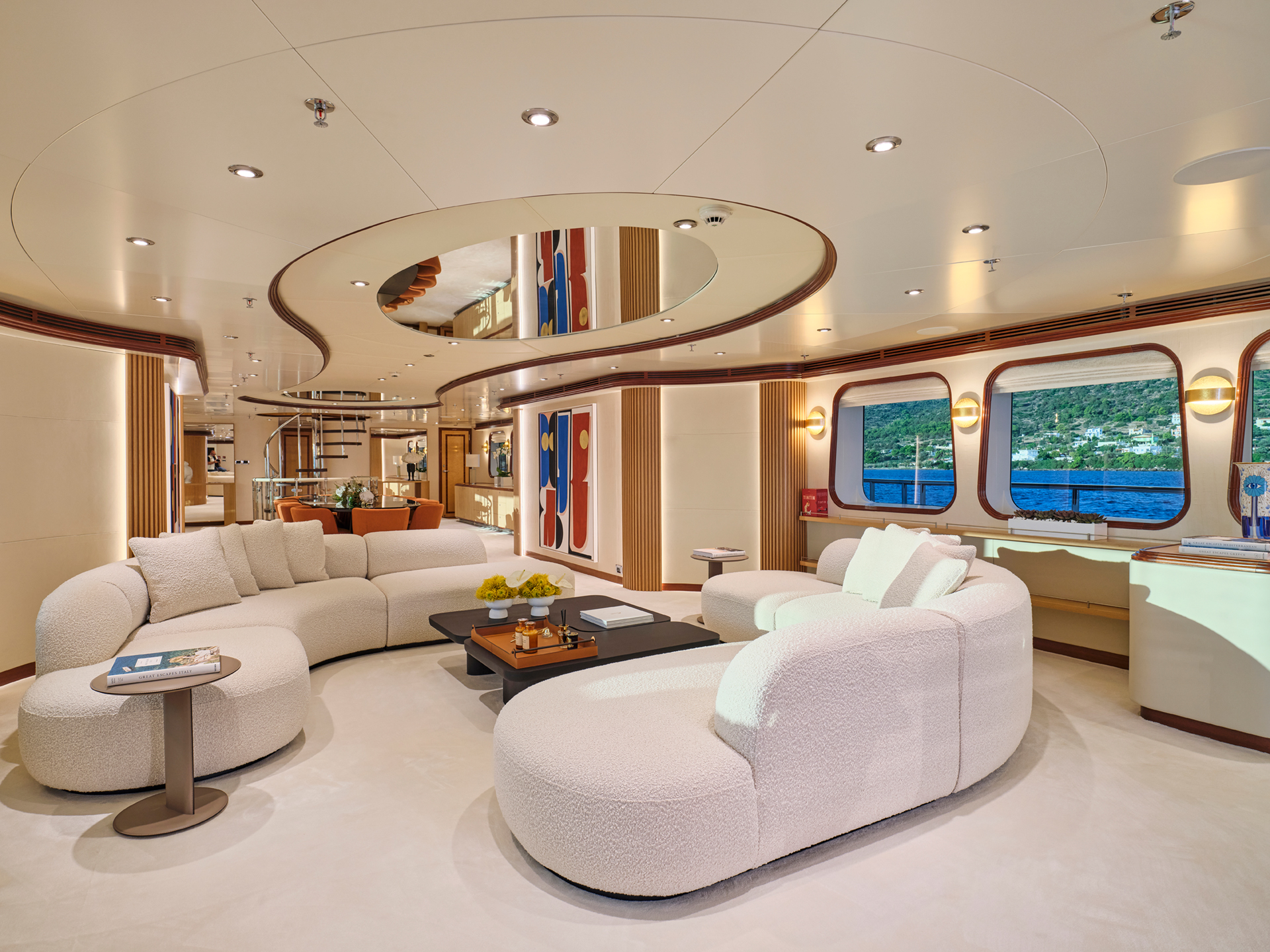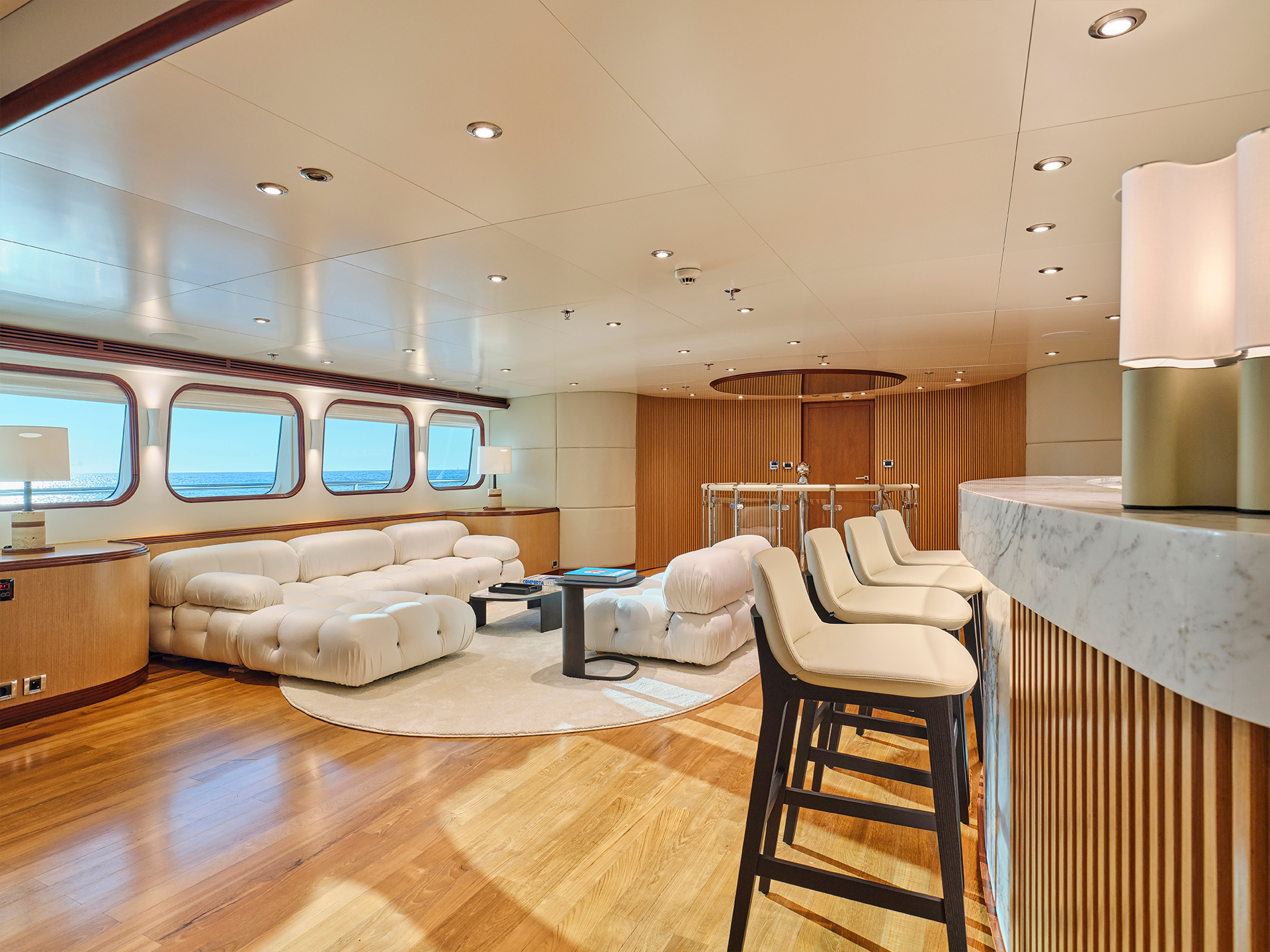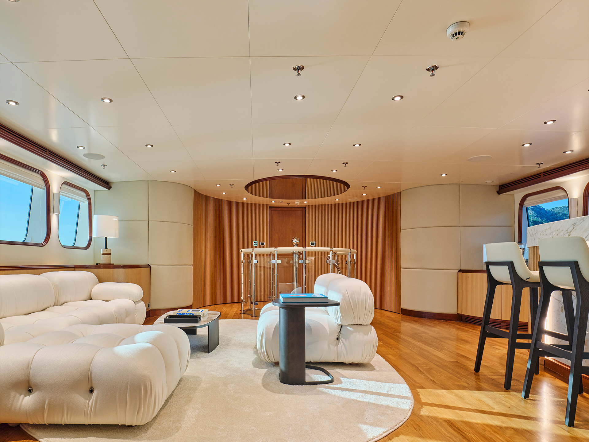 Across the two salons, contrasting tones and textures create distinct atmospheres while maintaining a sense of continuity, a philosophy that naturally extends to the cabins. On the sundeck, spacious lounging areas, a large bar, and a Jacuzzi coexist harmoniously with a touch-and-go helipad, all designed to invite relaxation and the enjoyment of life at sea.
