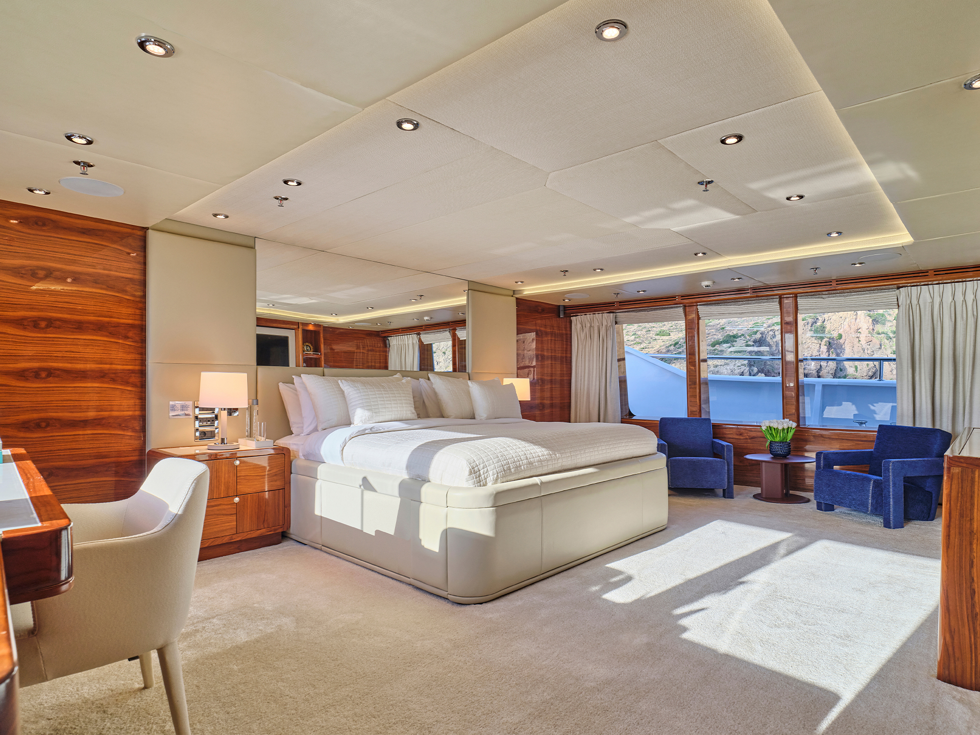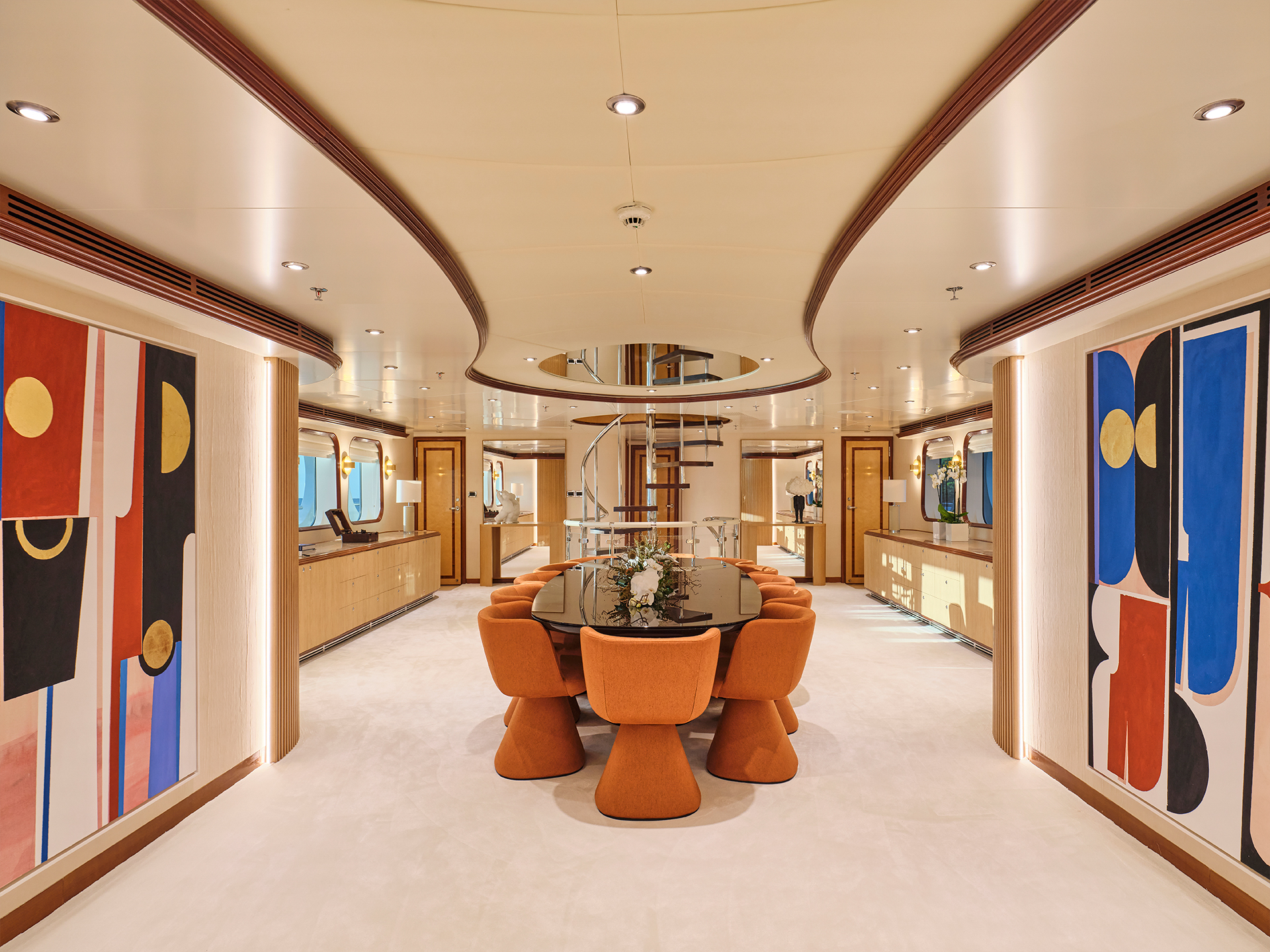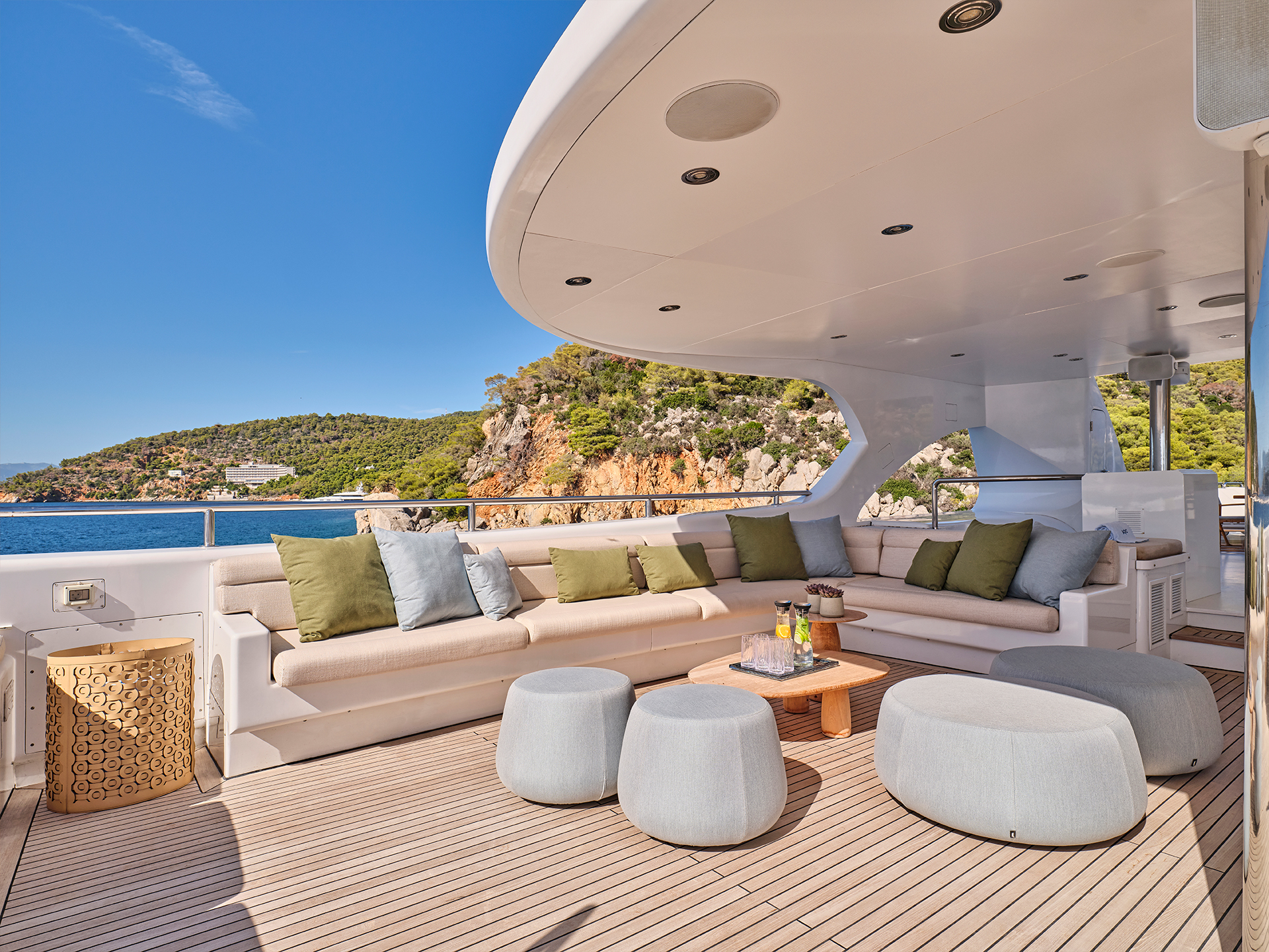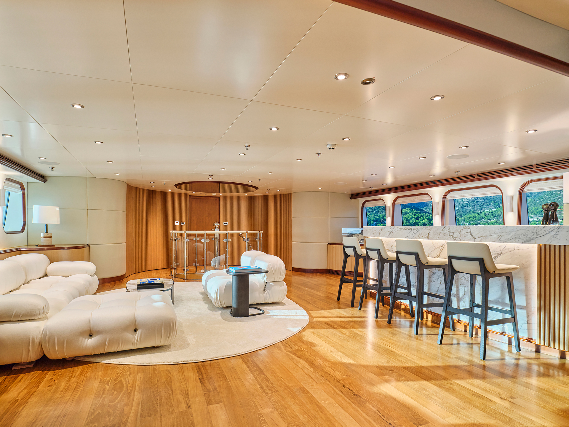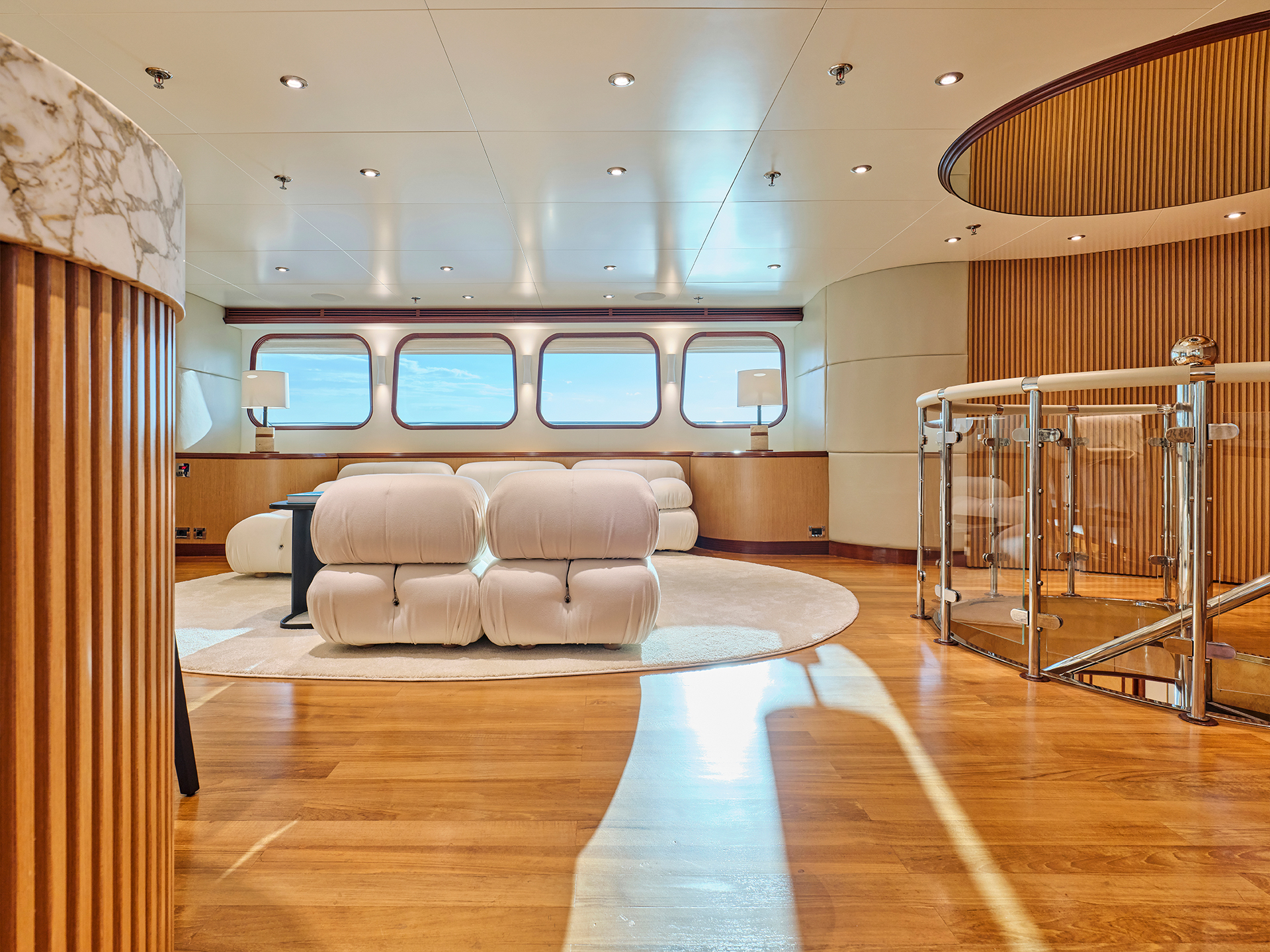 Across the two salons, contrasting tones and textures create distinct atmospheres while maintaining a sense of continuity, a philosophy that naturally extends to the cabins. On the sundeck, spacious lounging areas, a large bar, and a Jacuzzi coexist harmoniously with a touch-and-go helipad, all designed to invite relaxation and the enjoyment of life at sea.