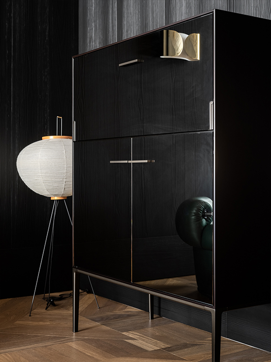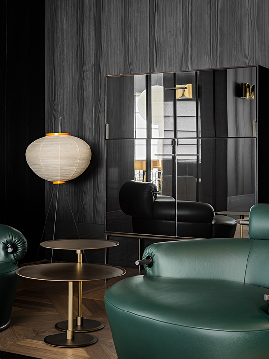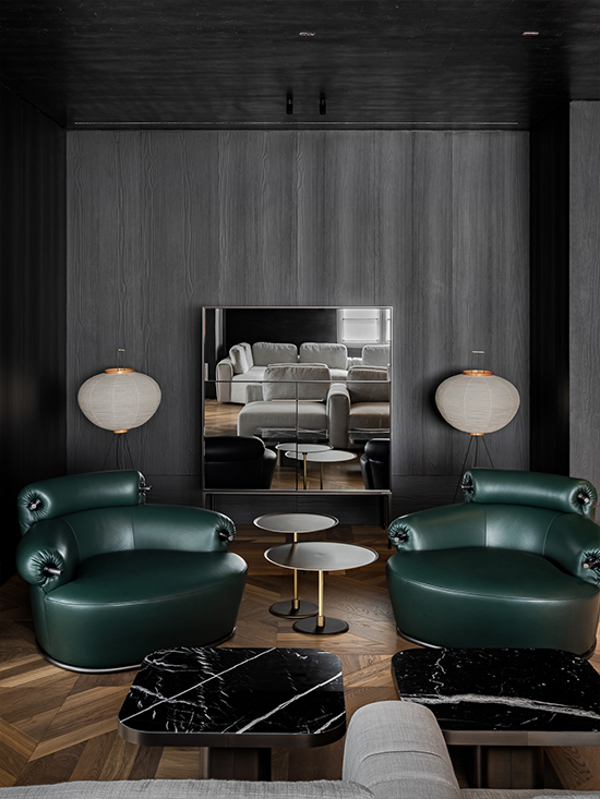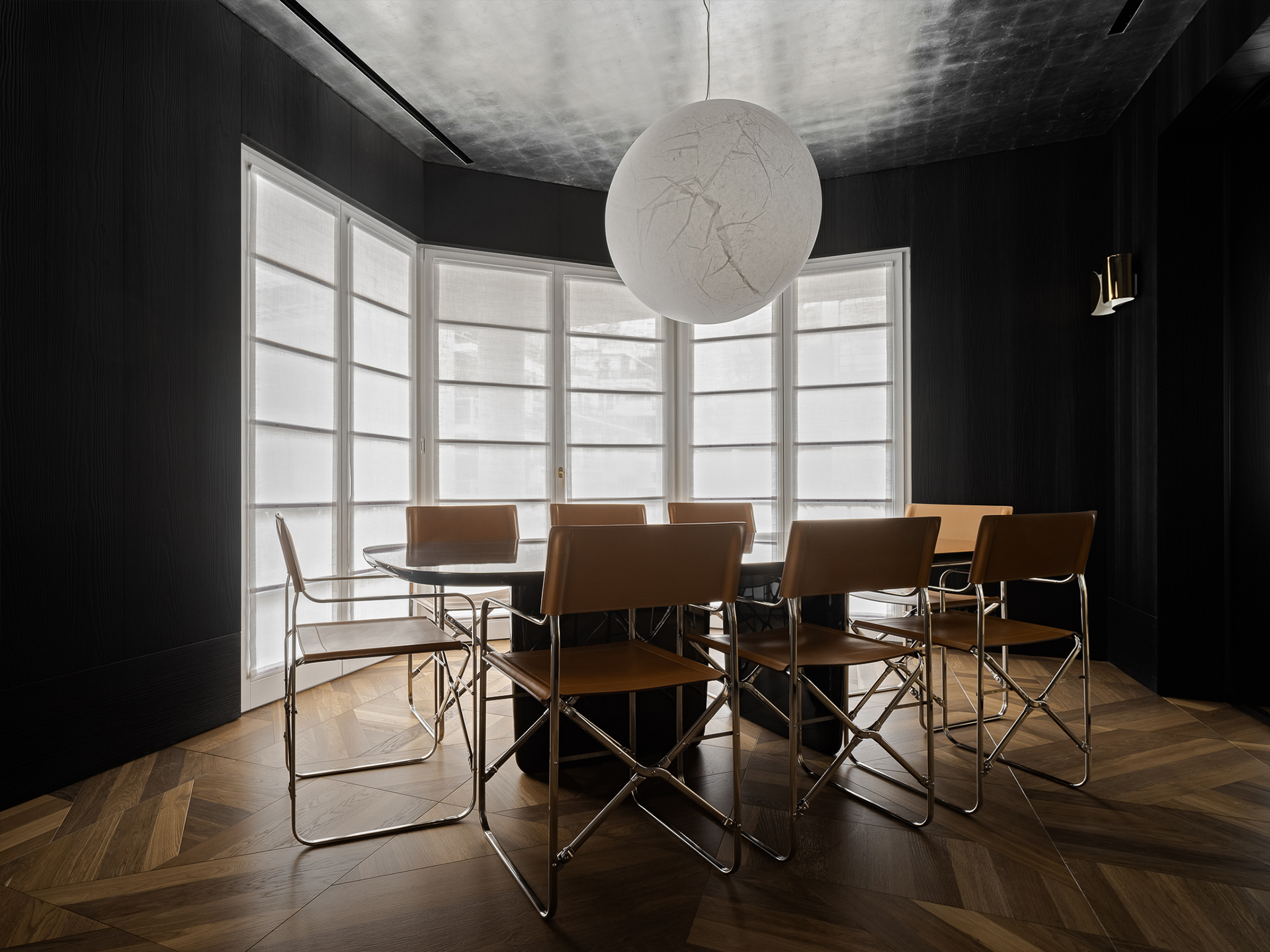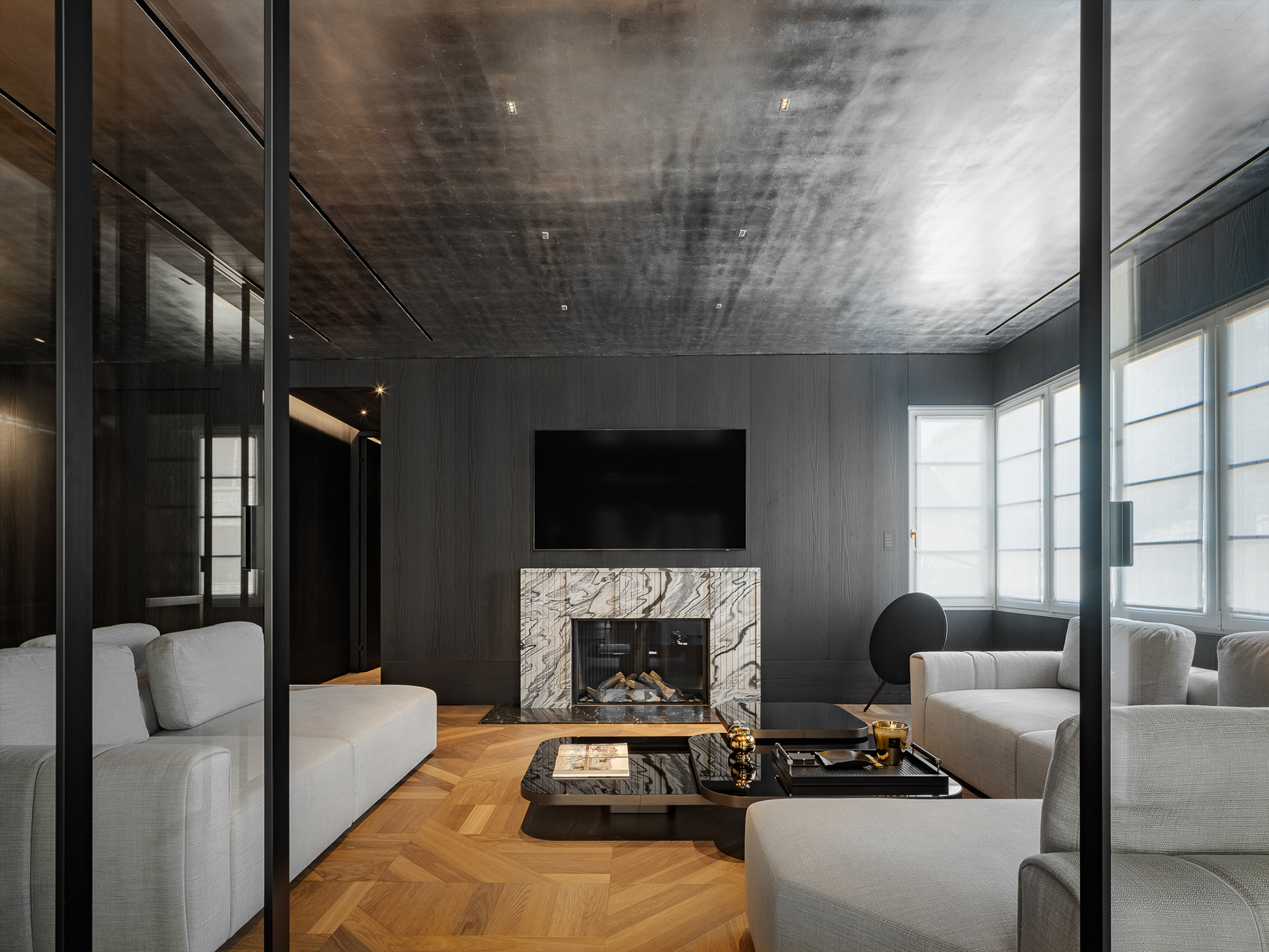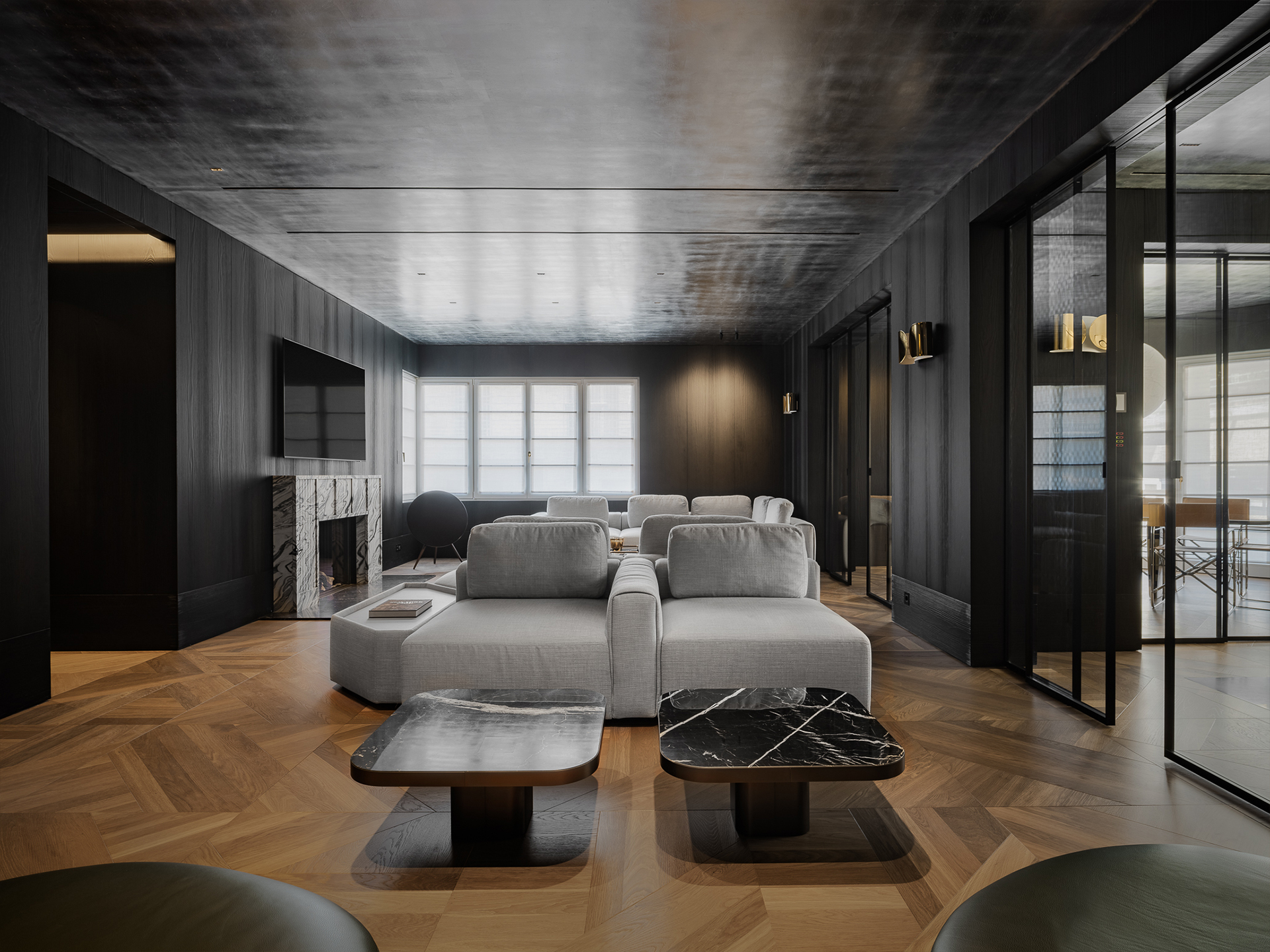 The design by Stage Design Office introduces a balanced palette: silver ceilings that subtly illuminate the interiors, black oak wall panels that anchor the space with depth, and warm wooden floors that soften the overall composition. Together, these elements create a cohesive atmosphere that feels both timeless and distinctly current.