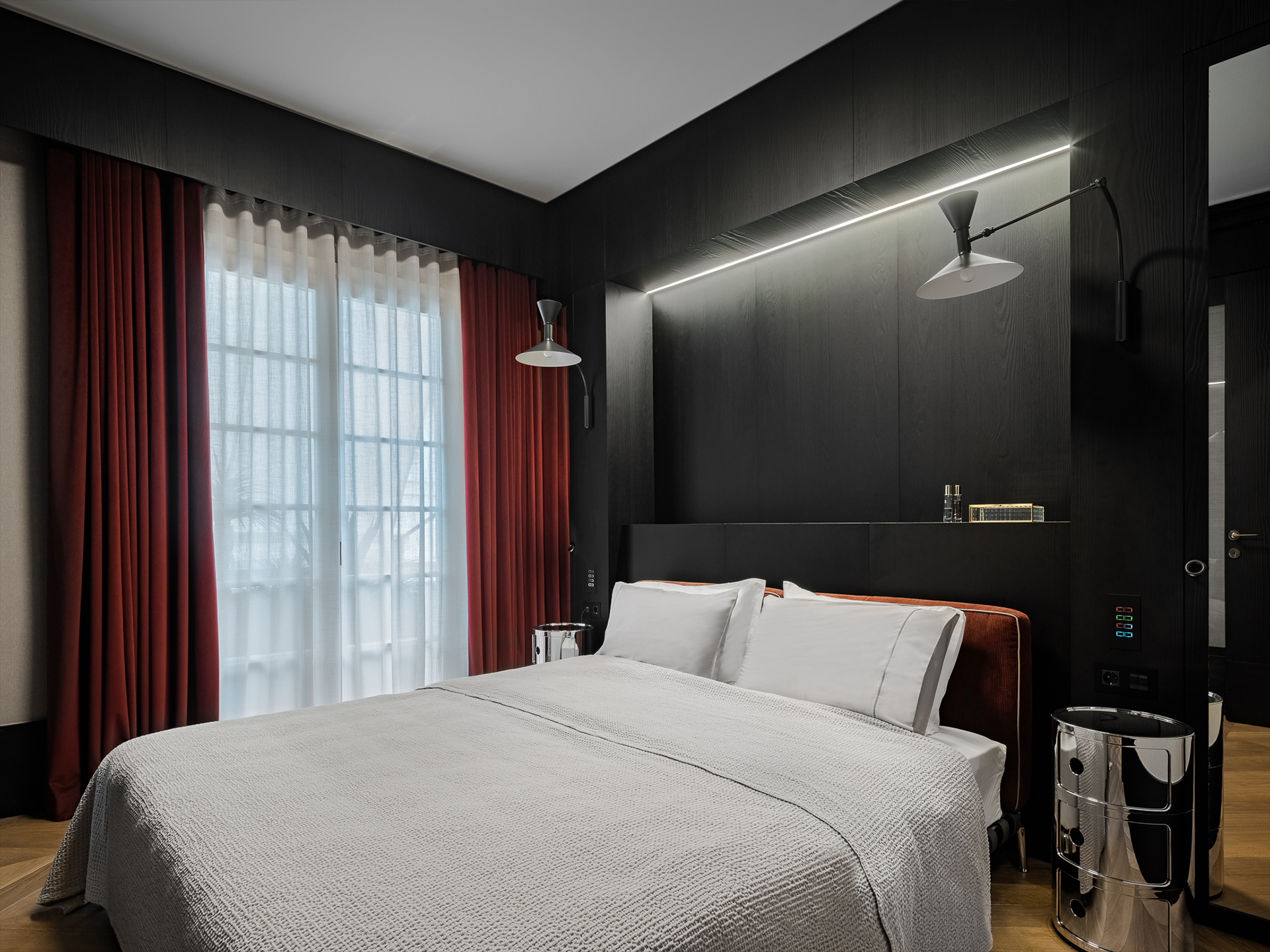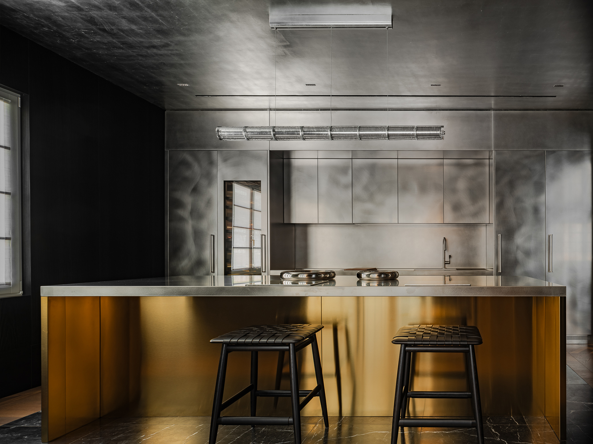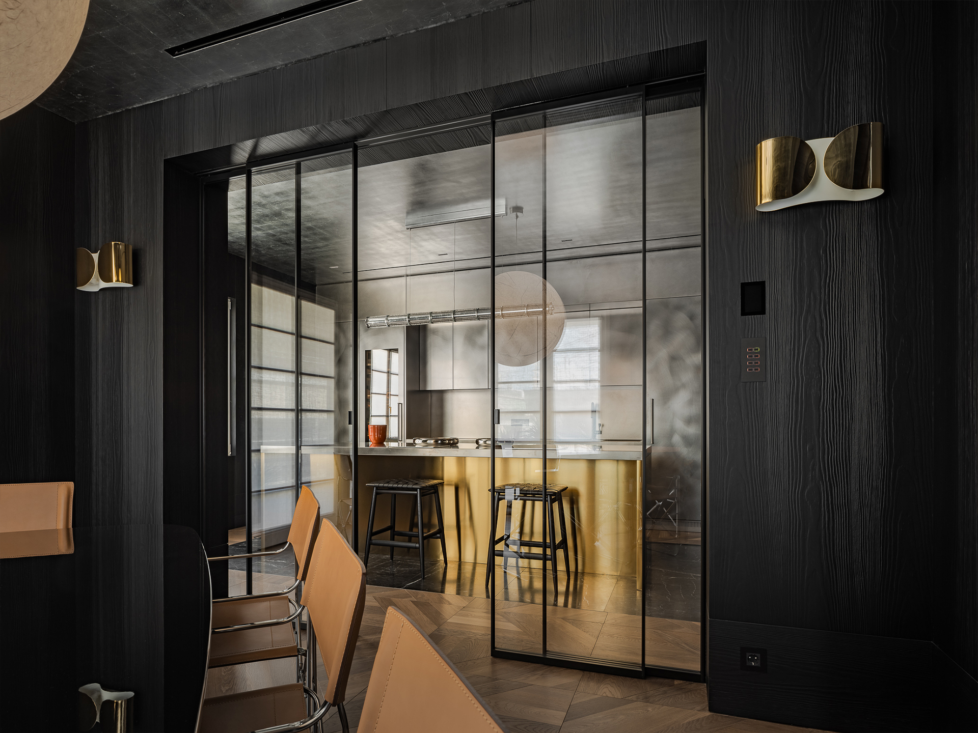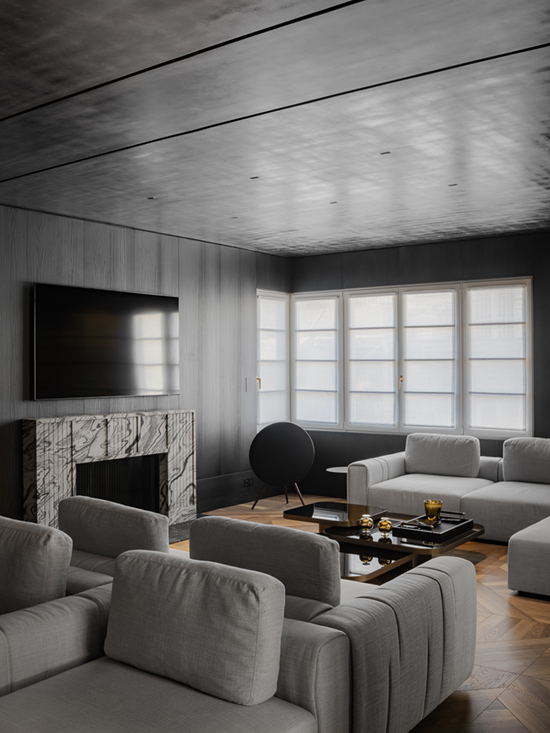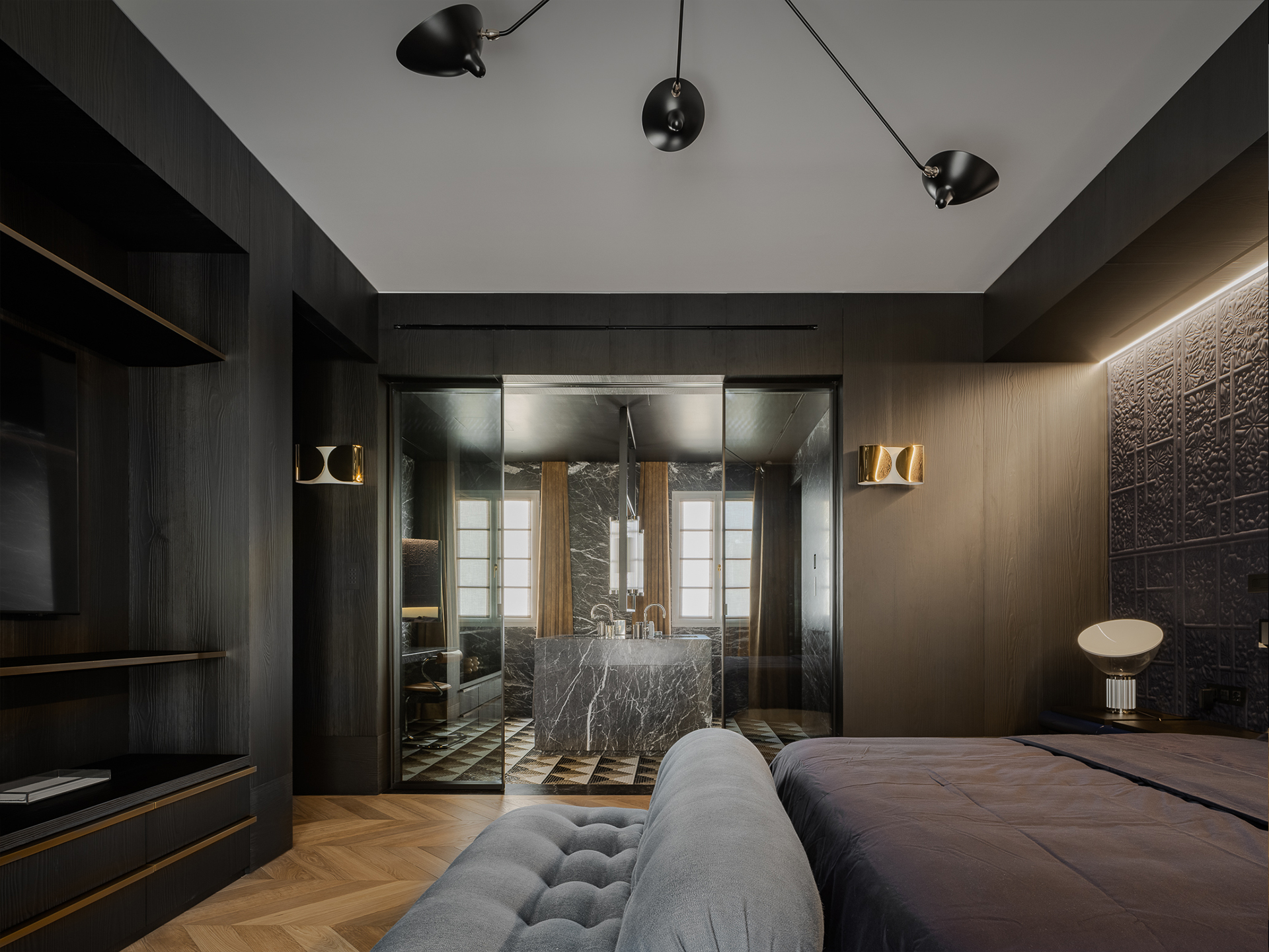 The design by Stage Design Office introduces a balanced palette: silver ceilings that subtly illuminate the interiors, black oak wall panels that anchor the space with depth, and warm wooden floors that soften the overall composition. Together, these elements create a cohesive atmosphere that feels both timeless and distinctly current.