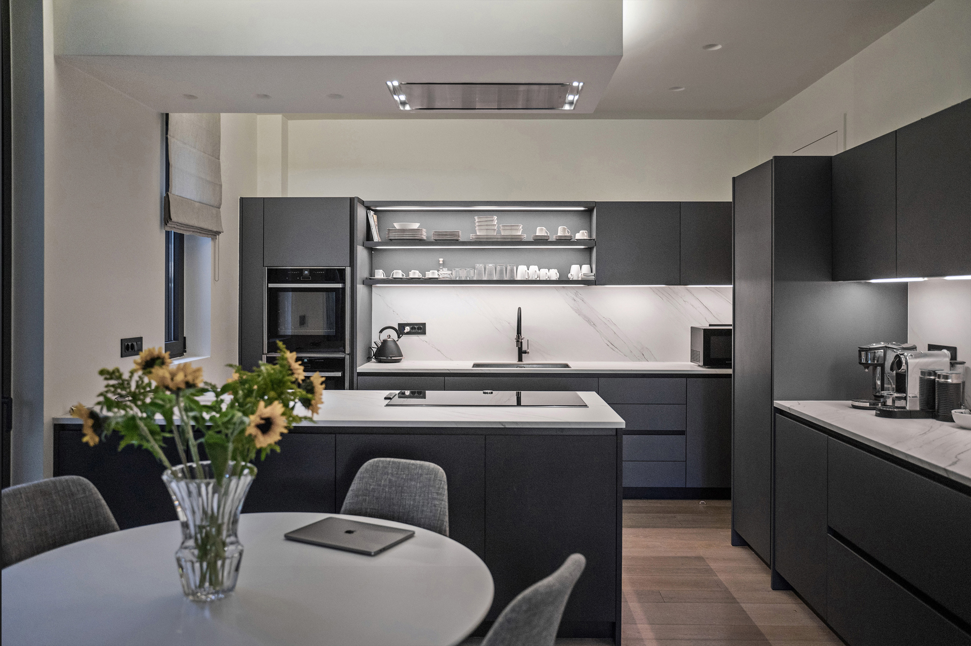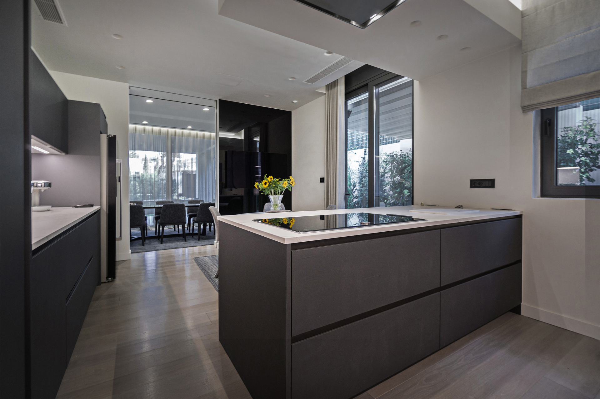 A brand new duplex in a wonderful, leafy Athens Northern suburb serves the purpose of home, tranquil sanctuary and space of joyous gatherings. A delicately designed, muted color palette creates an all-embracing feeling of peacefulness and calm from the moment one enters the space. The elegant scheme of light greys, charcoals, blacks and camel hues, combined with the glass expanse of floor-to-wall windows, allows daylight to flood the residence in an almost theatrical manner, while subtle touches of recessed lighting provide points of focus and atmospheric accents.