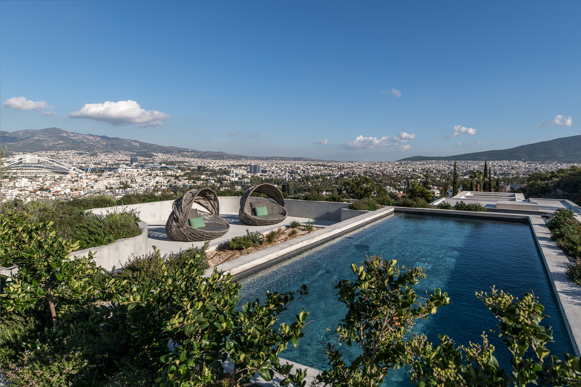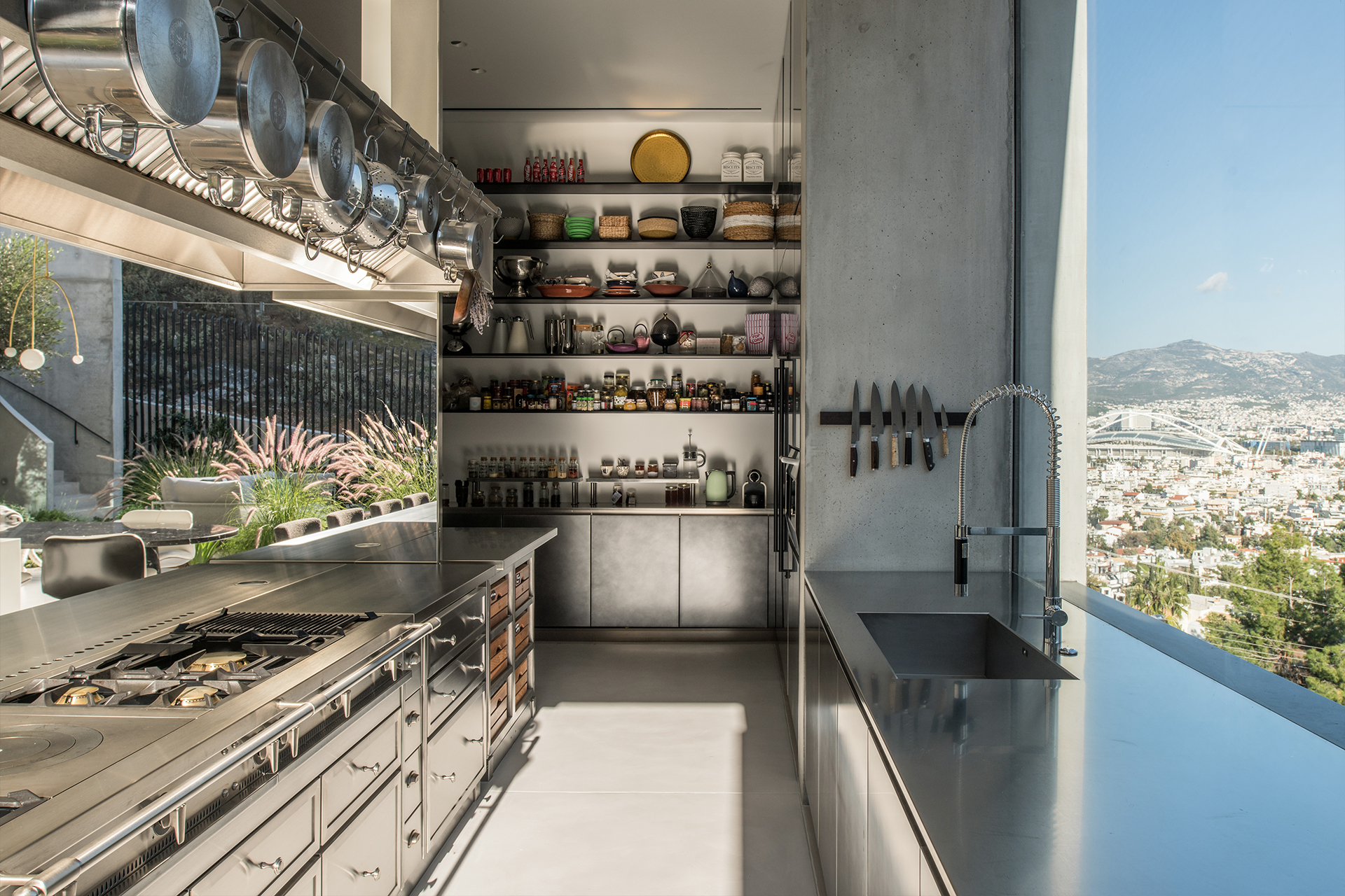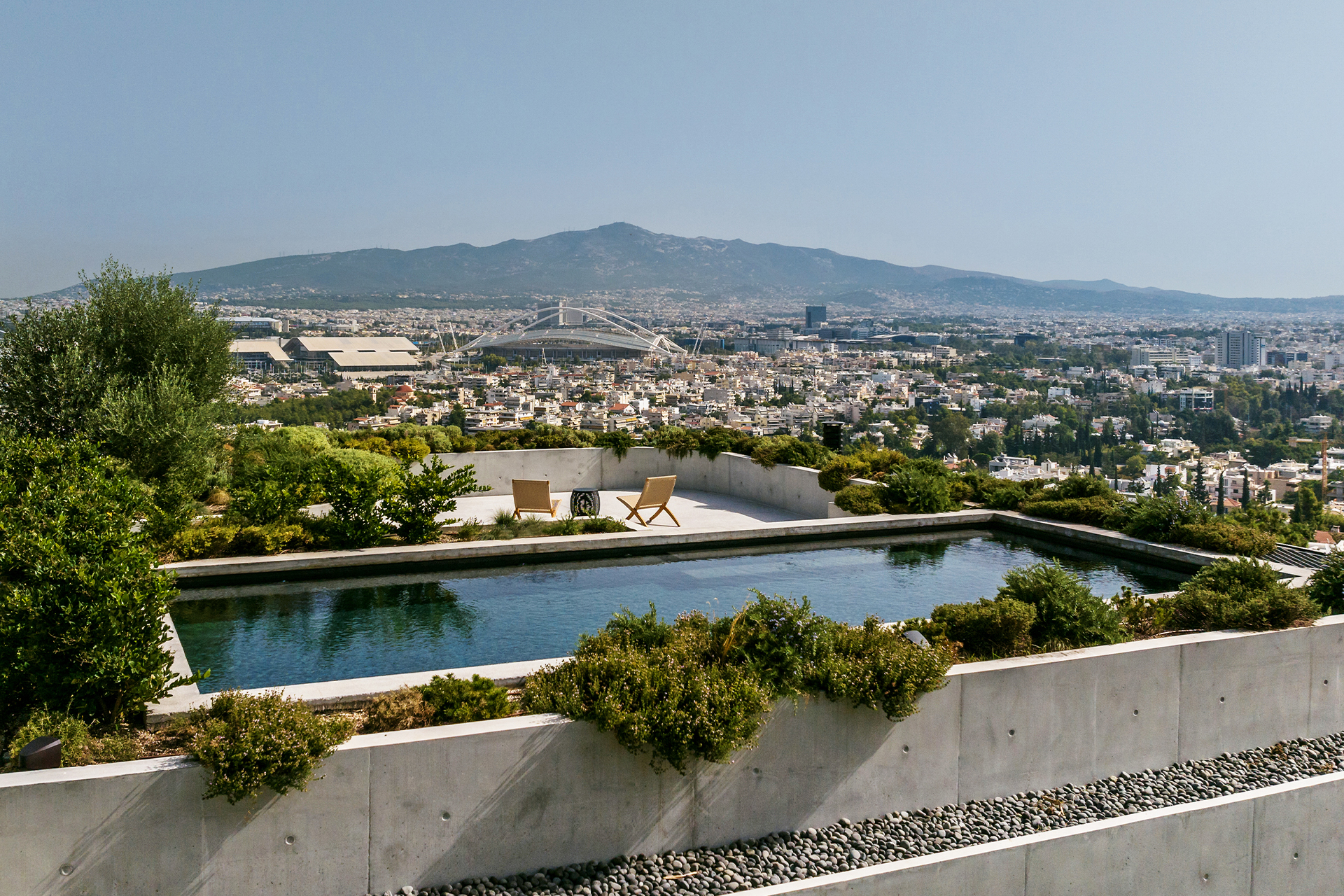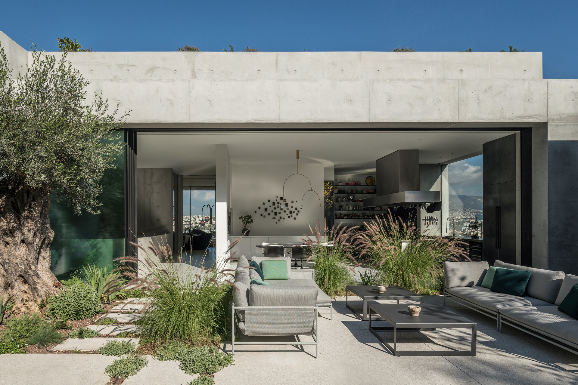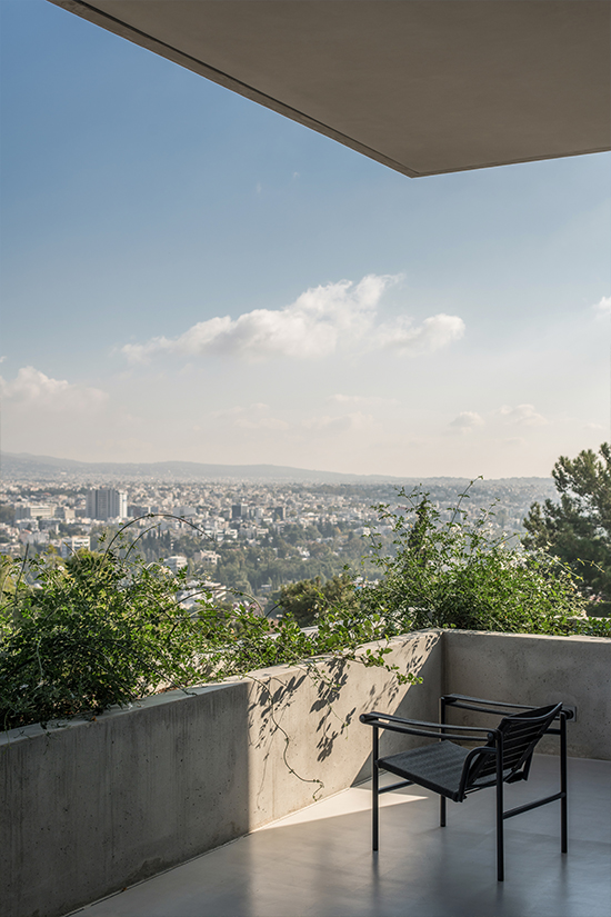 Embracing the original notion of Filothei as a garden city, Kallos Turin saw the garden as a way to counter the rigidity of the form and worked with Thomas Doxiades to create a densely planted native landscape as an extension of the preserved hillside from which the cube of the house emerges. The fence at the back offers an open connection to the nature preserve behind the house, highlighting the fluid relationship between the property and its natural surroundings. The landscape hints at the idea that the plants will ultimately engulf the architecture entirely.