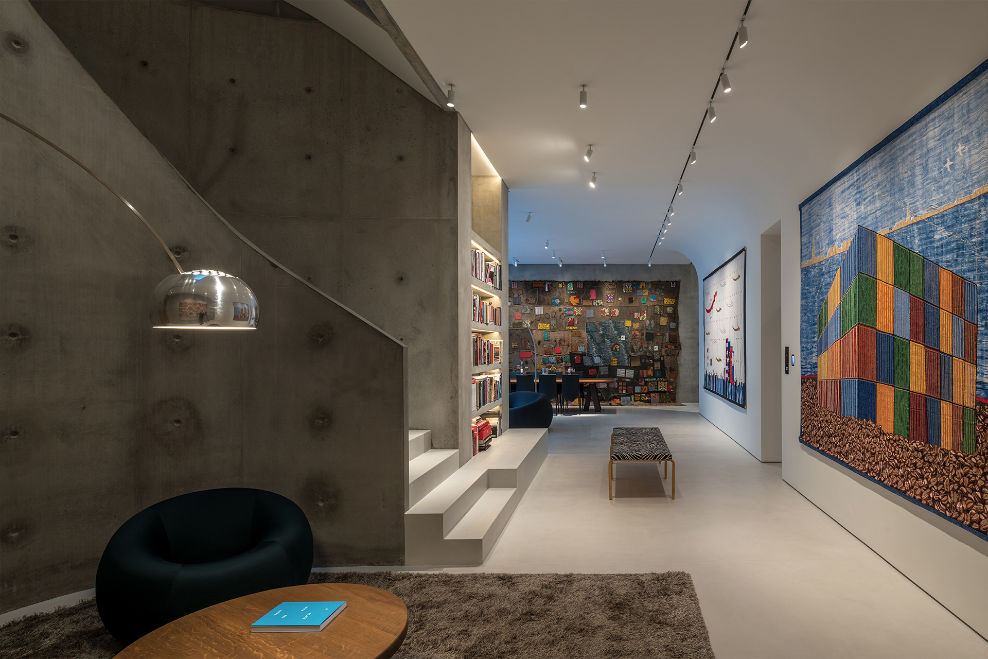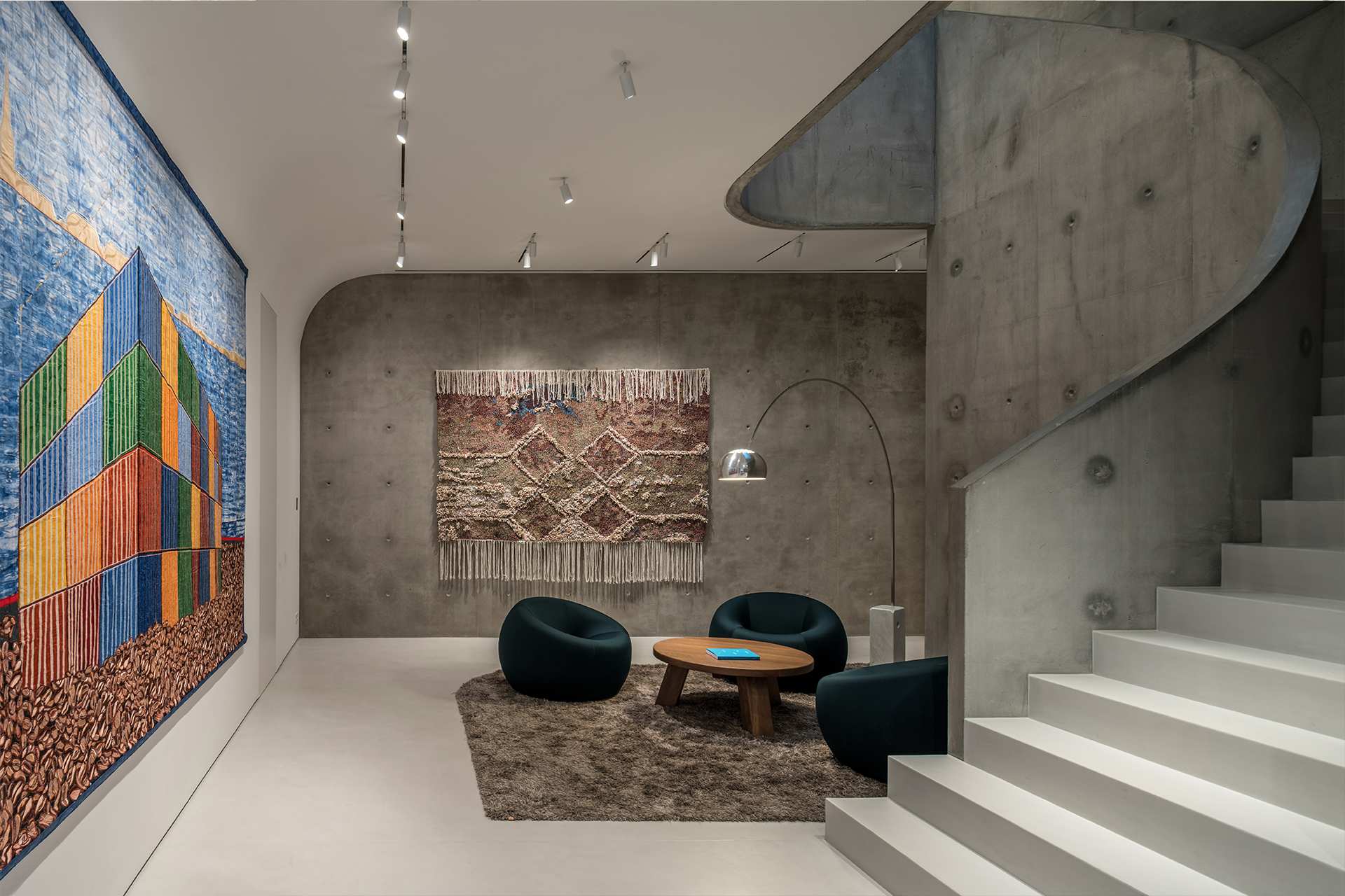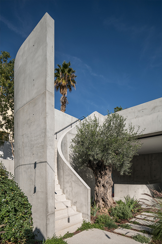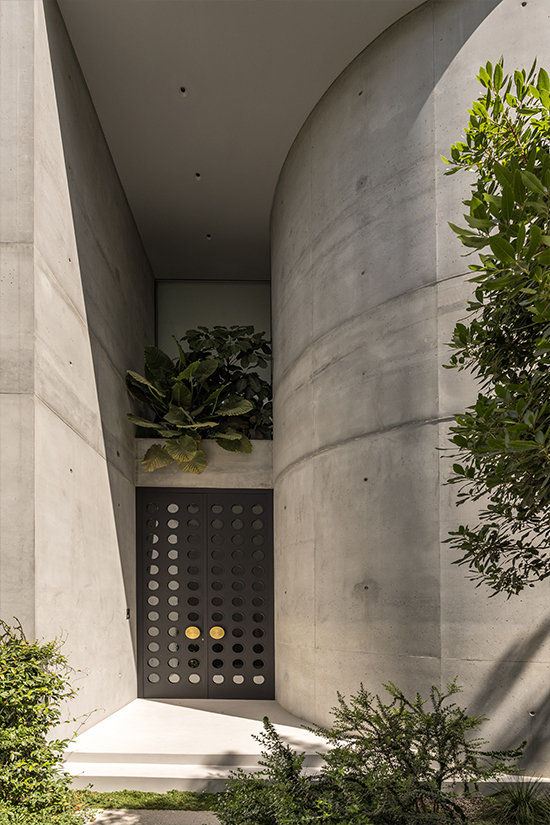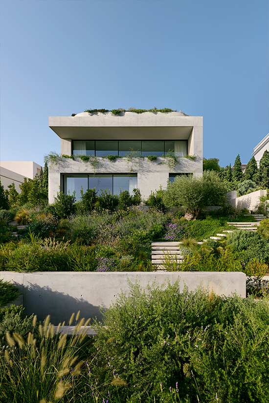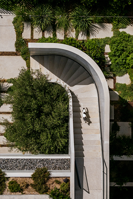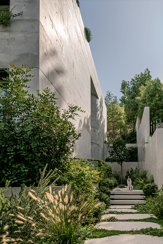 The concrete accentuates the sense of density and monolithic mass. Kallos Turin understood that this cubic volume needed a foil that pushed back against the rigidity of the form and used two key concepts to provide resistance: the sinuous lines of circulation through the house, and the garden surrounding it. The circulation from the street up through the site to the top levels was developed as a winding path and codified in the form of a subtle series of curves in concrete.