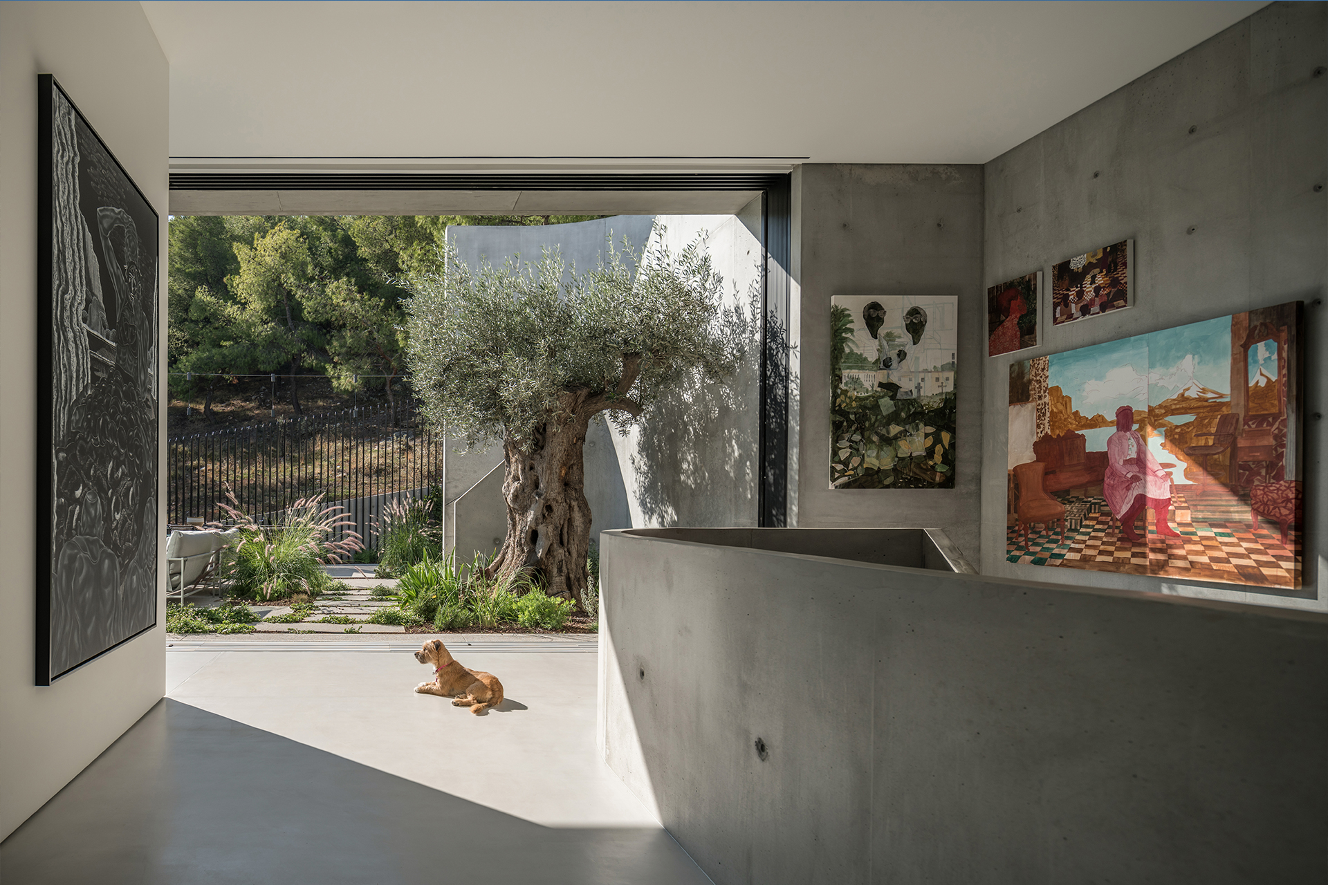 Art House is built within the green oasis of Filothei, a leafy neighbourhood nestled within the bustling metropolis of Athens. Filothei was developed in the 1920s as a garden oasis and preserved by strict codes constraining what could be built. These codes were at once the limitation and inspiration for the concept that Kallos Turin developed. The client needed enough square footage to house their world-class art collection in a gallery format as well as space for their extended families to converge. A dense cube was the shape that emerged from this combination of code and spatial requirements. But Kallos Turin saw these limitations as an opportunity and decided not only to embrace the cube form but to emphasize it by building in poured concrete.
