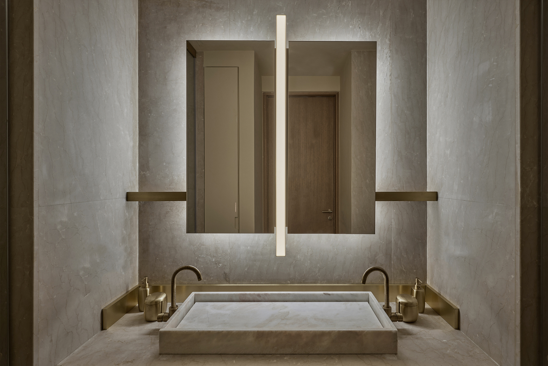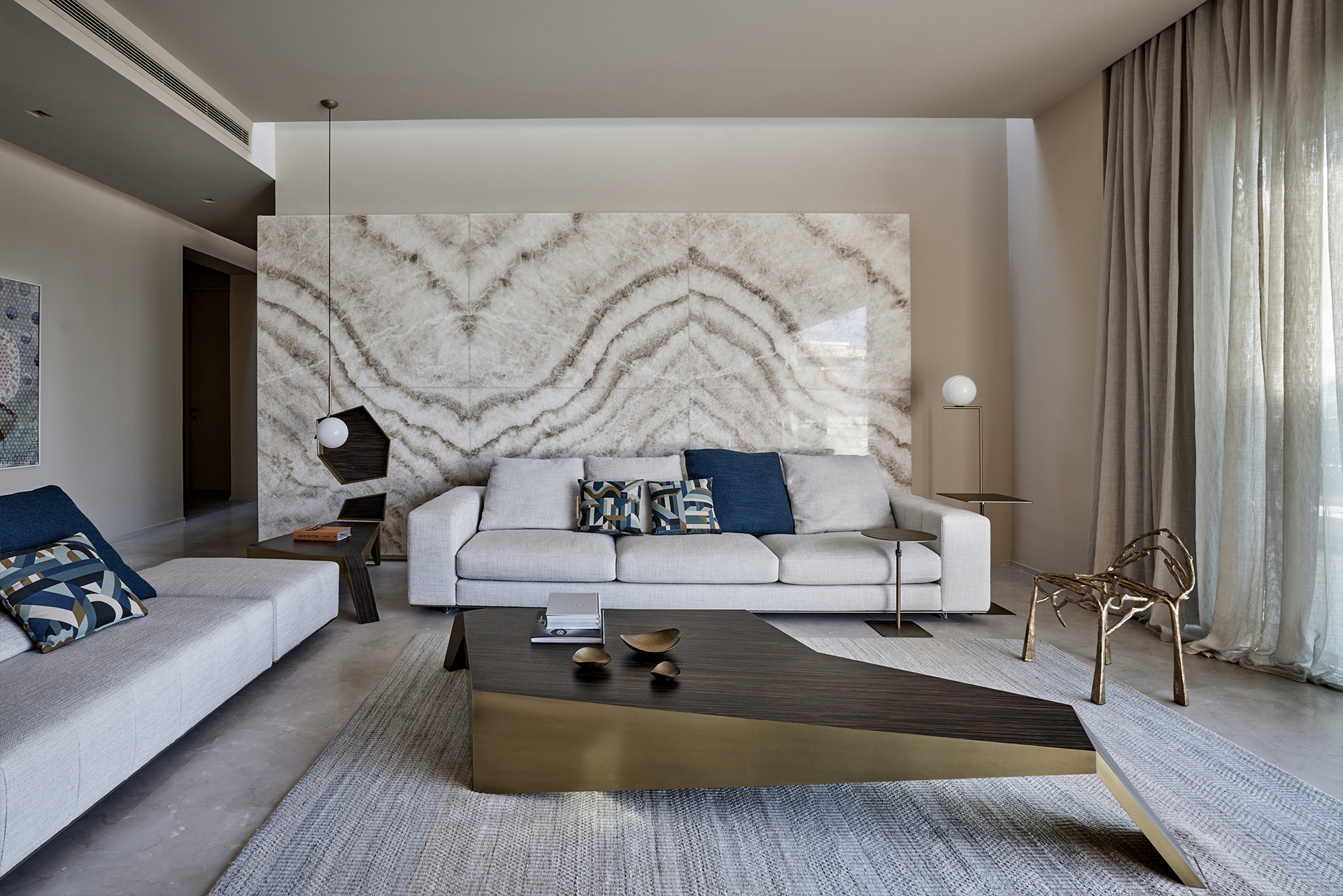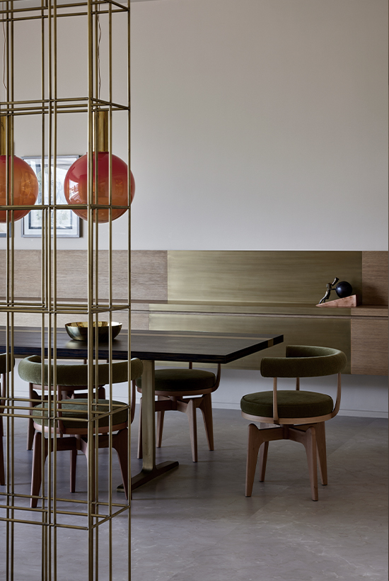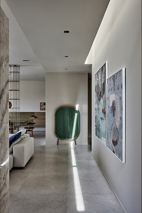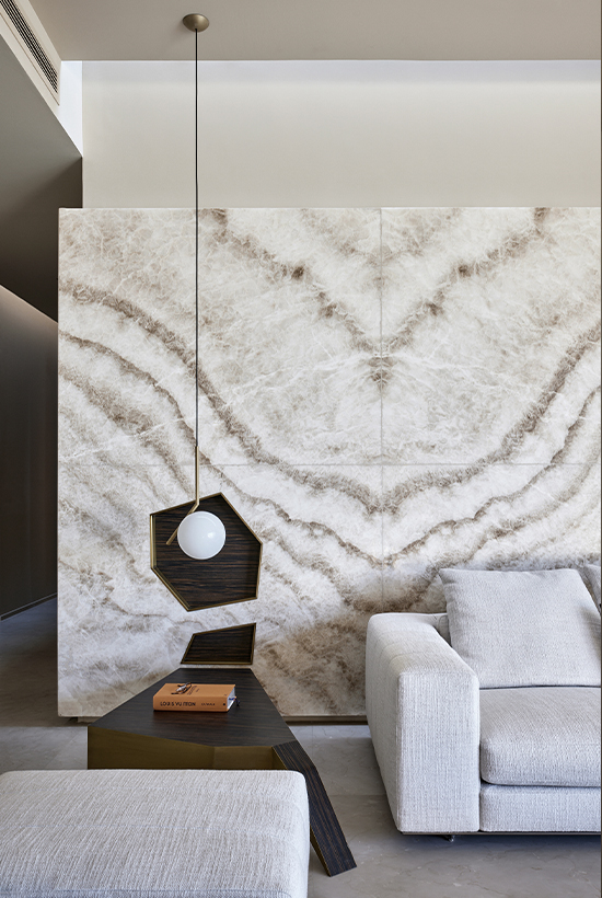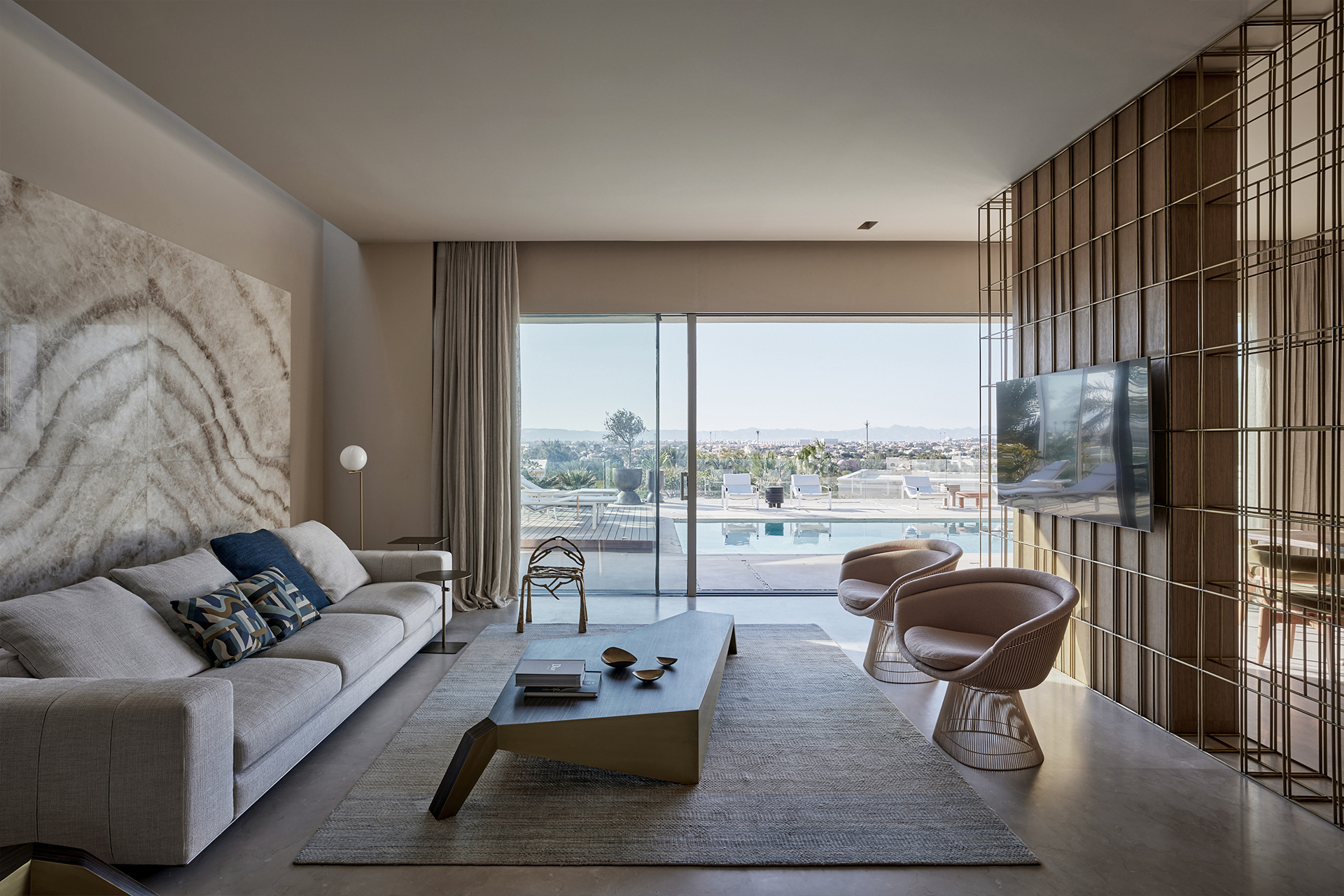 Wood, marble and metallic details summarize the material palette and at the same time allow natural lighting to be reflected and diffused in every point of the proposal, while the earth tones interact and merge with the tones found throughout the desert expanse.