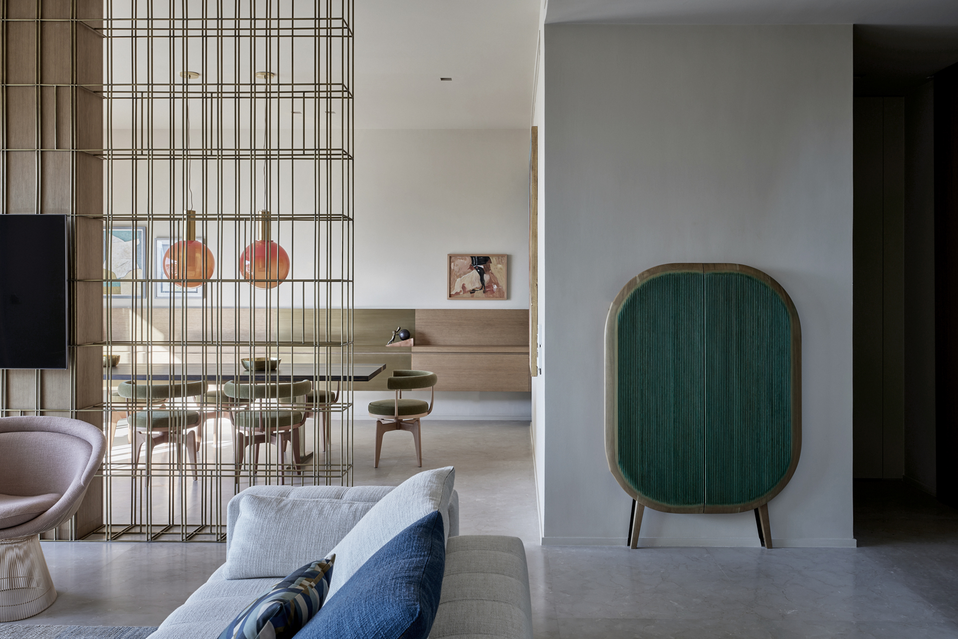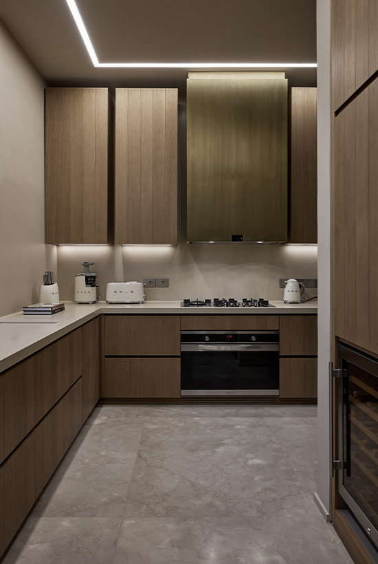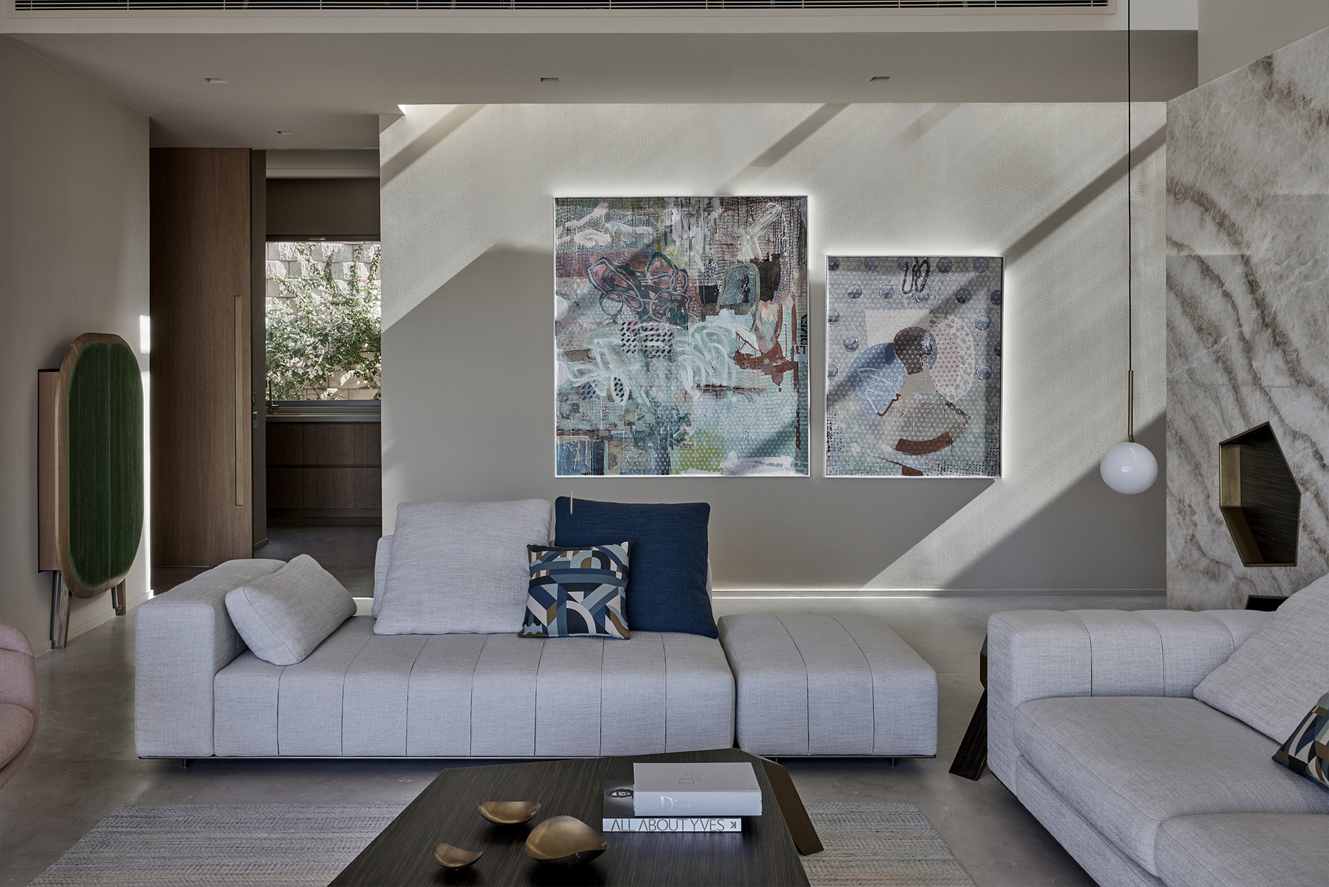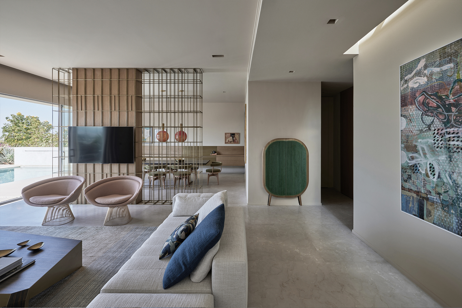 Wood, marble and metallic details summarize the material palette and at the same time allow natural lighting to be reflected and diffused in every point of the proposal, while the earth tones interact and merge with the tones found throughout the desert expanse.