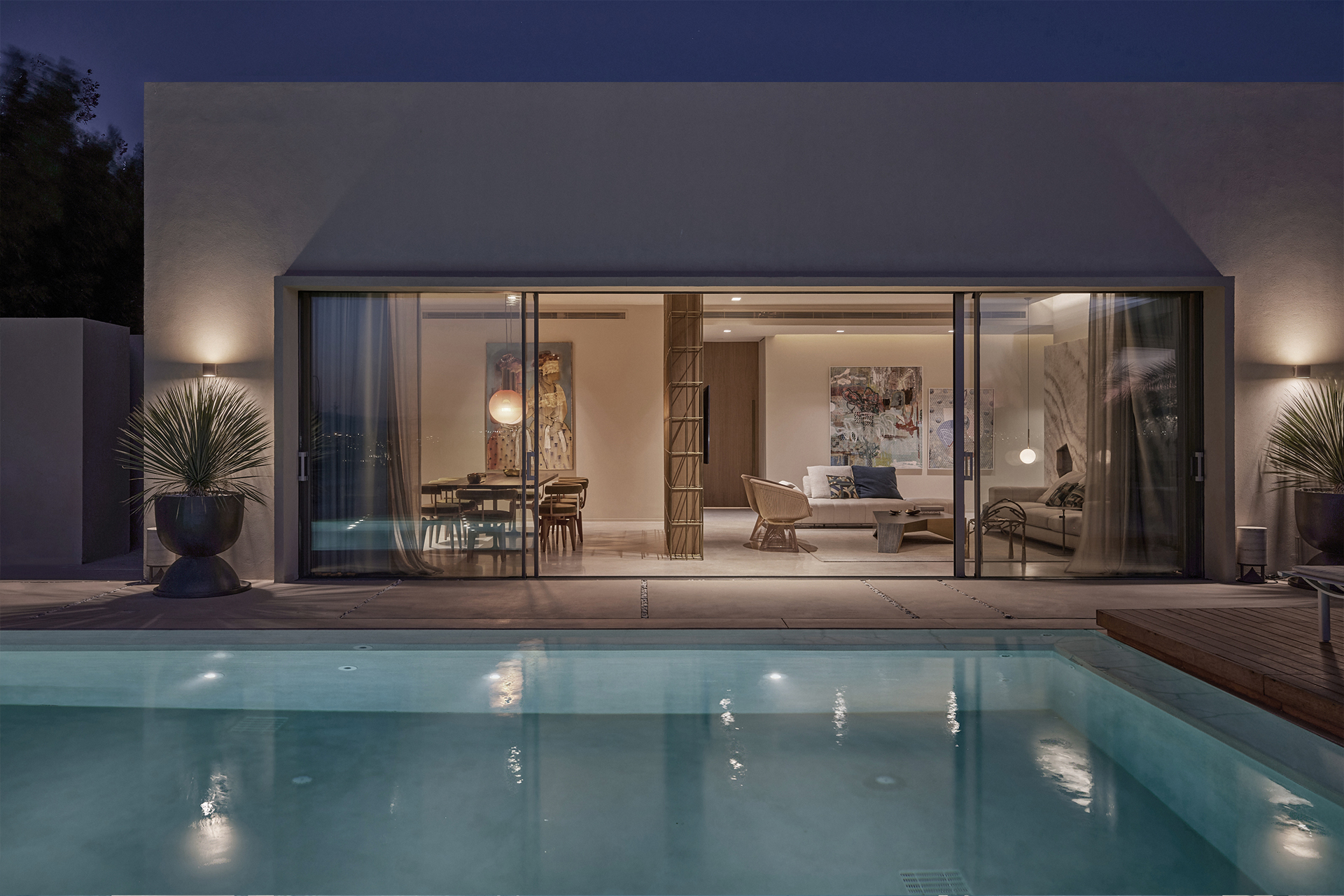 The main characteristic of the project is the unclear boundaries between the internal and external parts. The outdoor area of the residence is designed in such a way as to be the imaginary continuation of the building and vice versa. The pool, living area and dining area are arranged at the front of the building, with the height difference from the street allowing unobstructed views from every angle of the house.