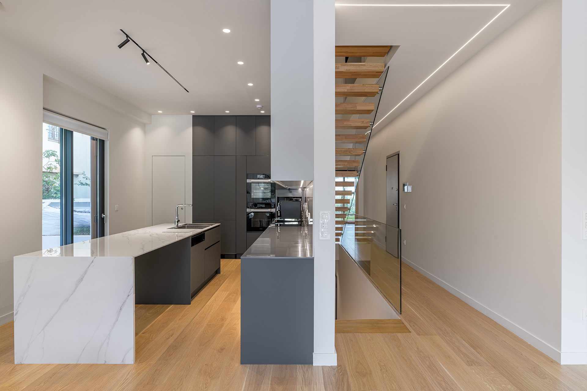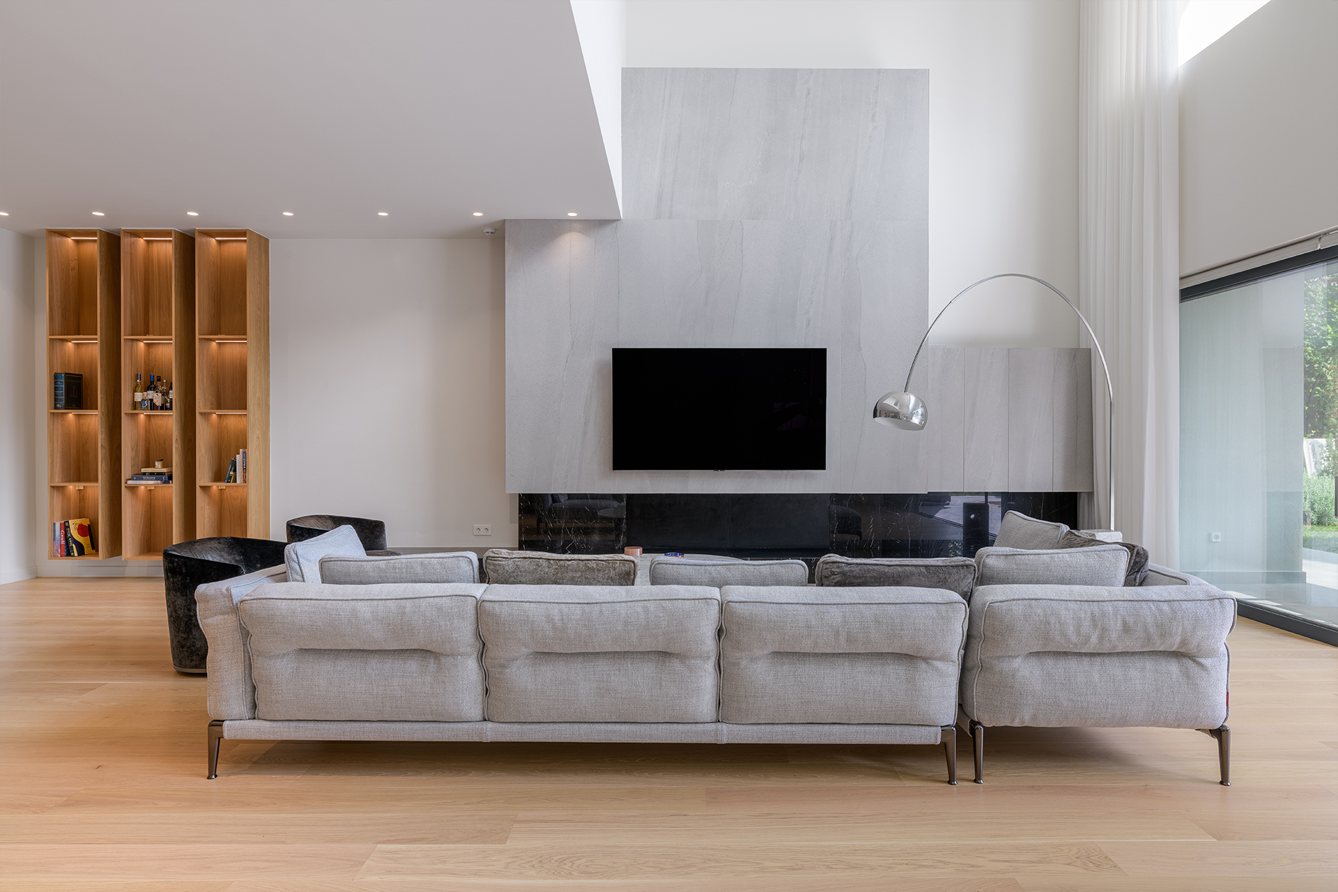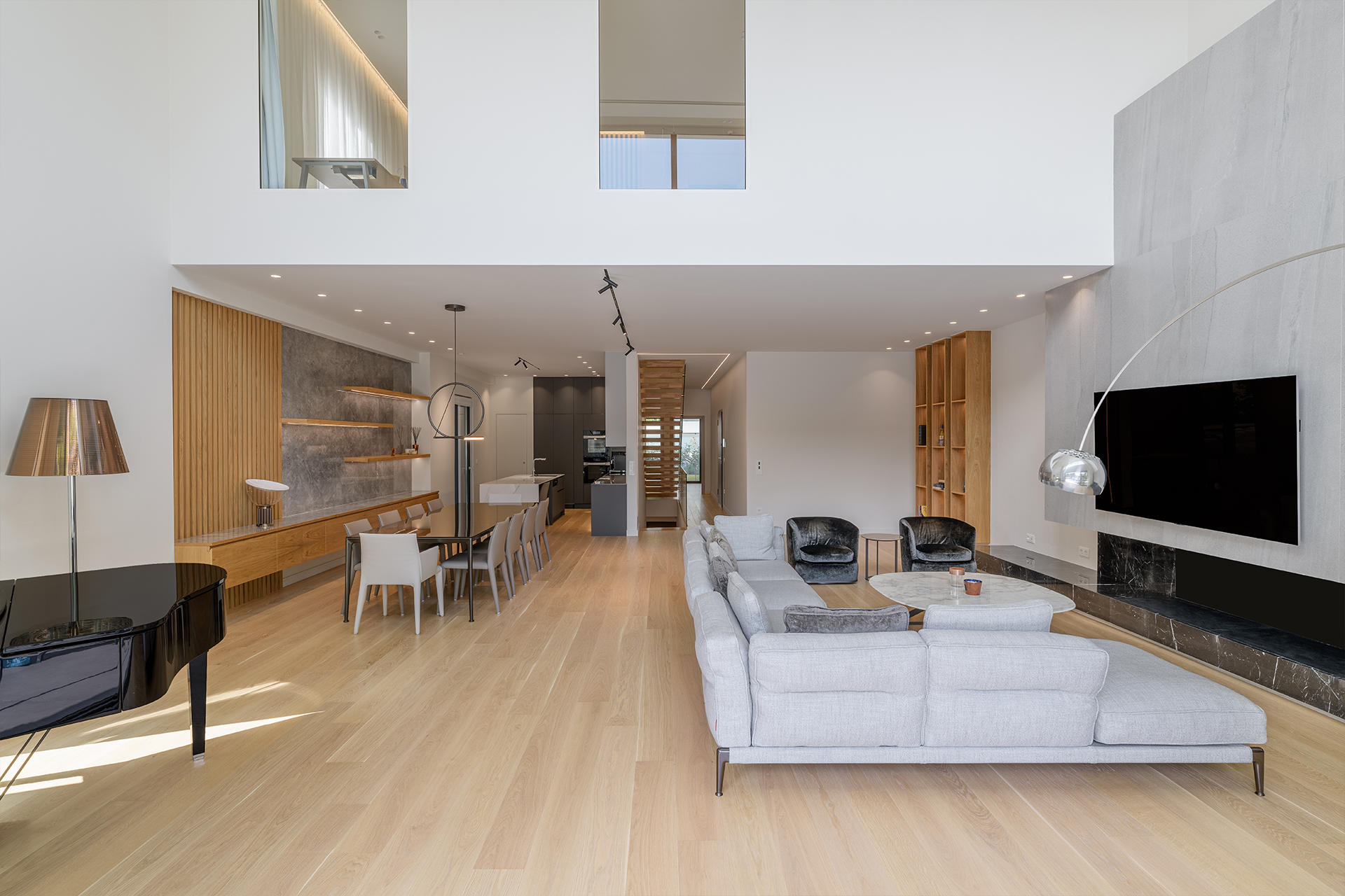 Natural materials, soft light and generous volumes define a home that feels calm, refined and timeless. At its heart, a double-height living space opens toward the garden, allowing interior and exterior to flow effortlessly together. Clean architectural lines and a restrained palette of oak, stone and soft neutral tones create an atmosphere of understated elegance. Large openings frame the surrounding greenery and invite natural light deep into the interior, changing the character of the home throughout the day. The result is a living environment that feels both sophisticated and welcoming—an understated expression of contemporary living where simplicity, proportion and comfort define the experience of the space. A contemporary home where simplicity, light and proportion shape the everyday