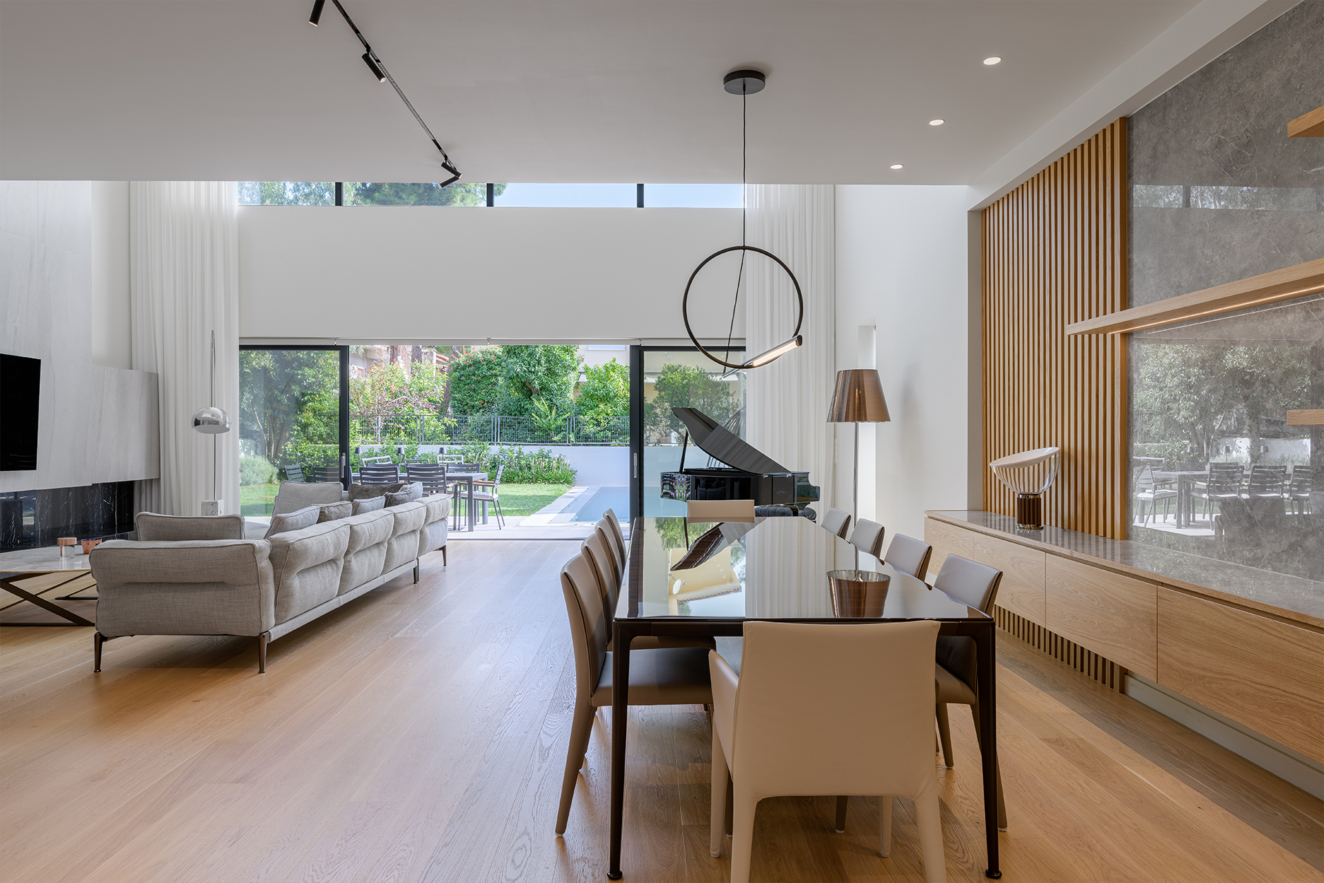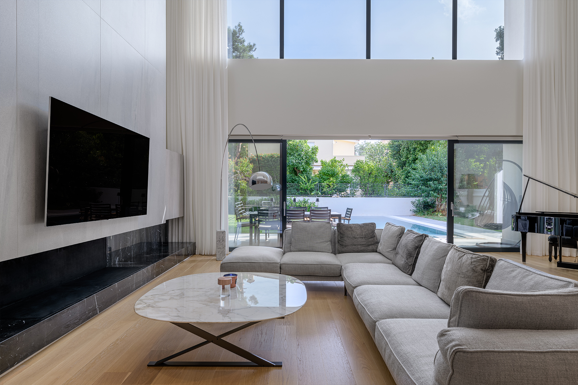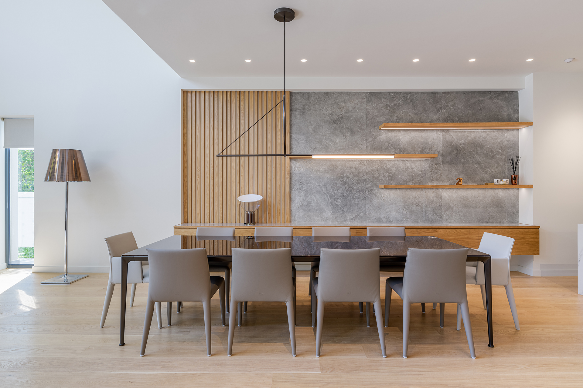 Natural materials, soft light and generous volumes define a home that feels calm, refined and timeless. At its heart, a double-height living space opens toward the garden, allowing interior and exterior to flow effortlessly together. Clean architectural lines and a restrained palette of oak, stone and soft neutral tones create an atmosphere of understated elegance. Large openings frame the surrounding greenery and invite natural light deep into the interior, changing the character of the home throughout the day. The result is a living environment that feels both sophisticated and welcoming—an understated expression of contemporary living where simplicity, proportion and comfort define the experience of the space. A contemporary home where simplicity, light and proportion shape the everyday